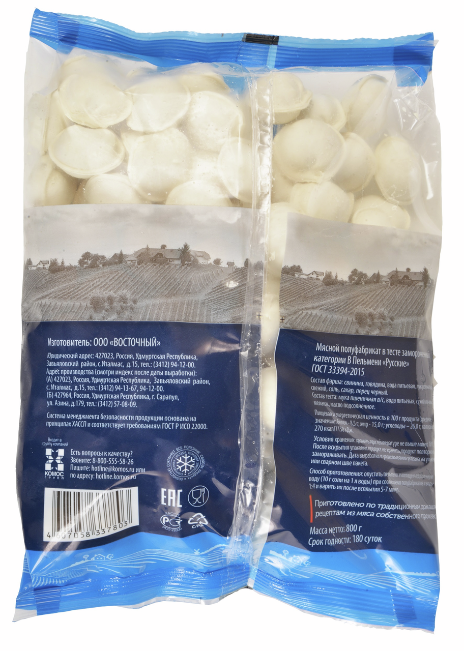 Традиционная линейка пельменей Восточный - любимое блюдо русской кухни, изготовленное по домашним рецептам в соответствии со стандартом качества ГОСТ. Насыщенный вкус отборного мяса собственных ферм, натуральные специи, нежное тесто из муки высшего сорта – все это проверенное временем блюдо для вас и ваших близких. Изготовлены по классической рецептуре с соблюдением стандартов ГОСТ. В их составе нет загустителей, усилителей вкуса и сои. В начинке – только отборное мясо высшего сорта и натуральные специи, а тесто для пельменей приготовлено из твердых сортов пшеницы. Отличный вариант для ужина на скорую руку. Говяжий и свиной фарш в сочетании с луком и черным перцем - классическая начинка для пельменей. Тесто готовят из муки, яиц, соли и воды. Продукт приготовлен без загустителей, усилителей вкуса и влагоудерживающих добавок. Для изготовления используется отборное охлажденное мясо.