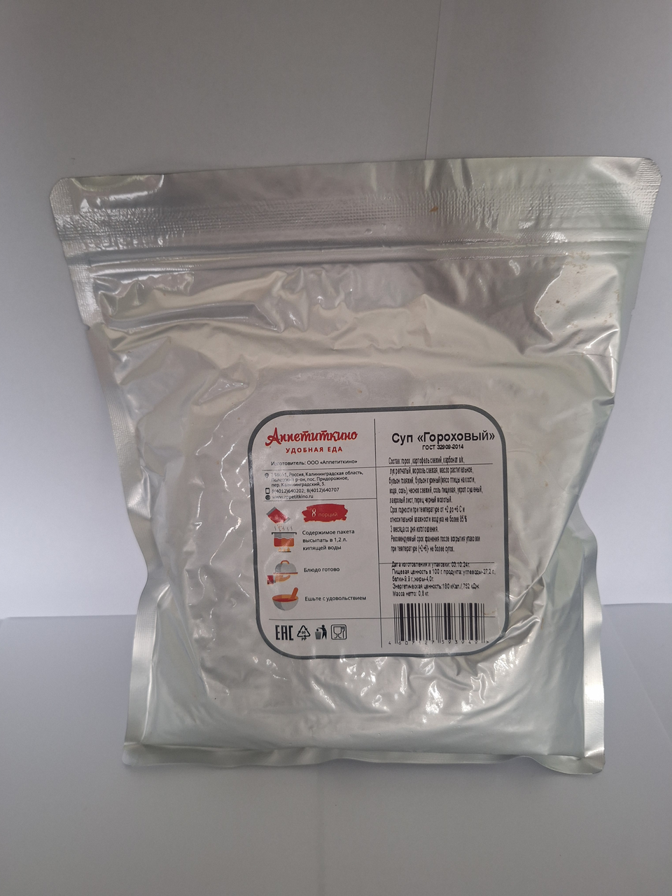 Горох, картофель свежий, карбонад варено-копченый, лук репчатый, морковь свежая, масло растительное, бульон говяжий, бульон куриный мясо птицы на кости, вода, соль, чеснок свежий, соль пищевая, укроп сушеный, лавровый лист, перец сушеный молотый.