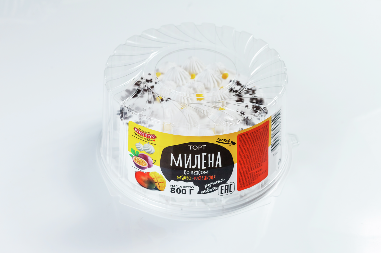 Торт бисквитный с ванильным бисквитом, прослойкой из нежного суфле, сливочного крема с манго и маракуйей.