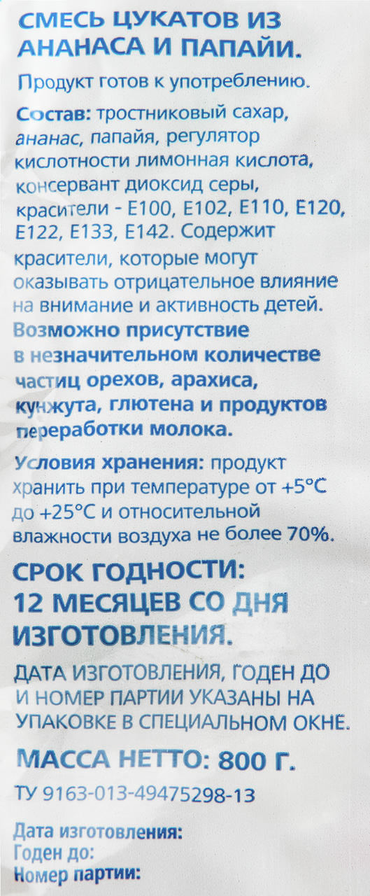 Тростниковый сахар, ананас, папайя, регулятор кислотности лимонная кислота, консервант диоксид серы, красители - Е100, Е102, Е110, Е120, Е122, Е133, E142.