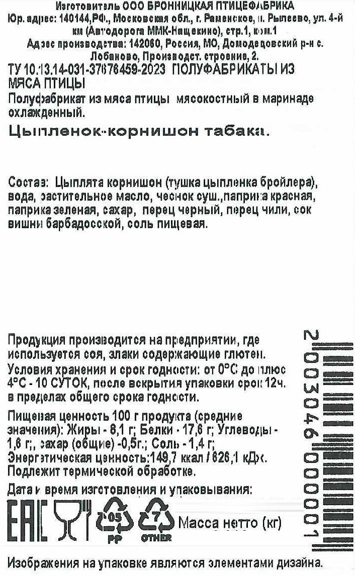 Цыпленок-корнишон табака Бронницкая ПФ охлажденный, ~800г