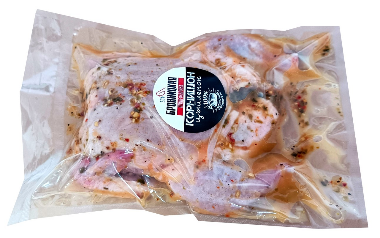 Цыплята корнишон (тушка цыпленка бройлера), вода, растительное масло, чеснок сушеный, паприка красная, паприка зеленая, сахар, перец черный, перец чили, сок вишни барбадосской, соль пищевая.