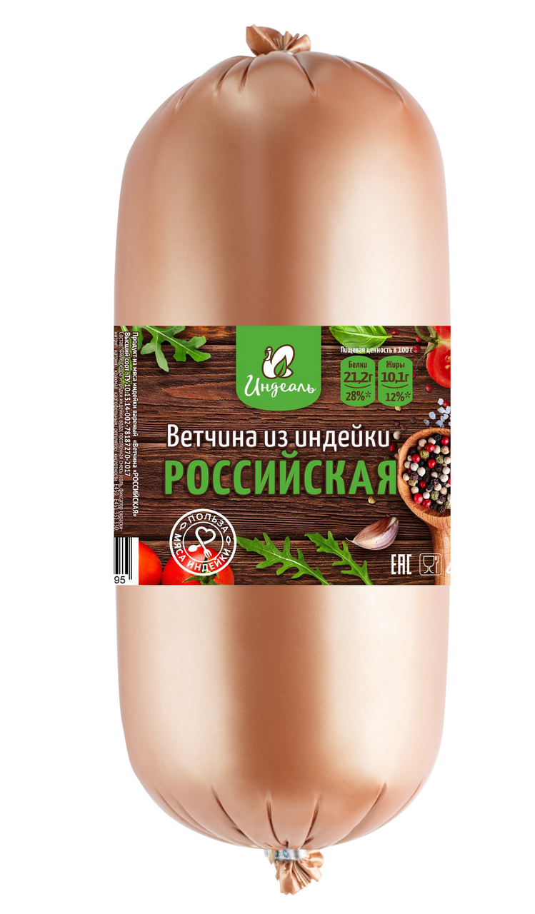 Ветчина Индеаль Российская, 800г – вкусный натуральный продукт из отборных ингредиентов, который отличается повышенным содержанием белка, выступающего в качестве основного строительного материала для организма. Также в ней содержится ряд витаминов и минералов, немаловажных для здоровья человека. При этом она стимулирует аппетит и быстро утоляет чувство голода. Ветчину часто используют в качестве закуски, которая может дополнить любой стол: как повседневный, так и праздничный. Кроме того, такой мясной продукт широко применяется для приготовления салатов, рулетов и разнообразных начинок. Выпускается в плотной и герметичной упаковке, защищающей содержимое от внешнего воздействия. Приобрести ветчину Индеаль Российская, 800г можно в торговом центре METRO.Под торговой маркой Индеаль выпускается широкий ассортимент колбасной и мясной продукции из индейки. Производство расположено в Ставропольском крае. Предприятие, оснащенное современным оборудованием, способно производить тысячи тонн продукции ежегодно, что позволяет удовлетворить потребности жителей не только края, но и других регионов страны в диетических продуктах из индейки глубокой переработки. Для производства продукции используется индейка, выращенная в соответствии с технологией свободного выгула. Строгий контроль на каждом этапе производственного цикла обеспечивает высокое качество мясных изделий.
