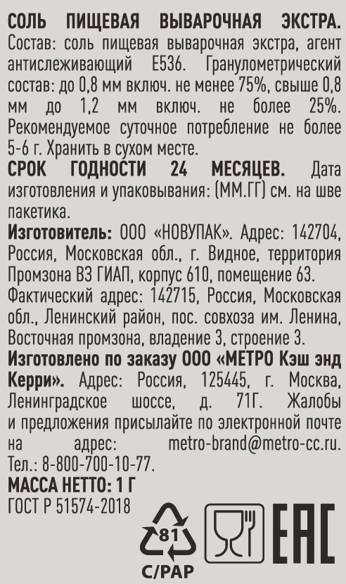 Соль пищевая выварочная Экстра, антислеживающий агент Е536.