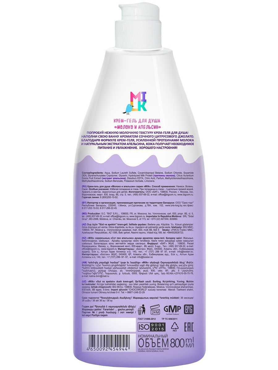 Крем-гель для душа Milk для душа молоко и апельсин, 800мл