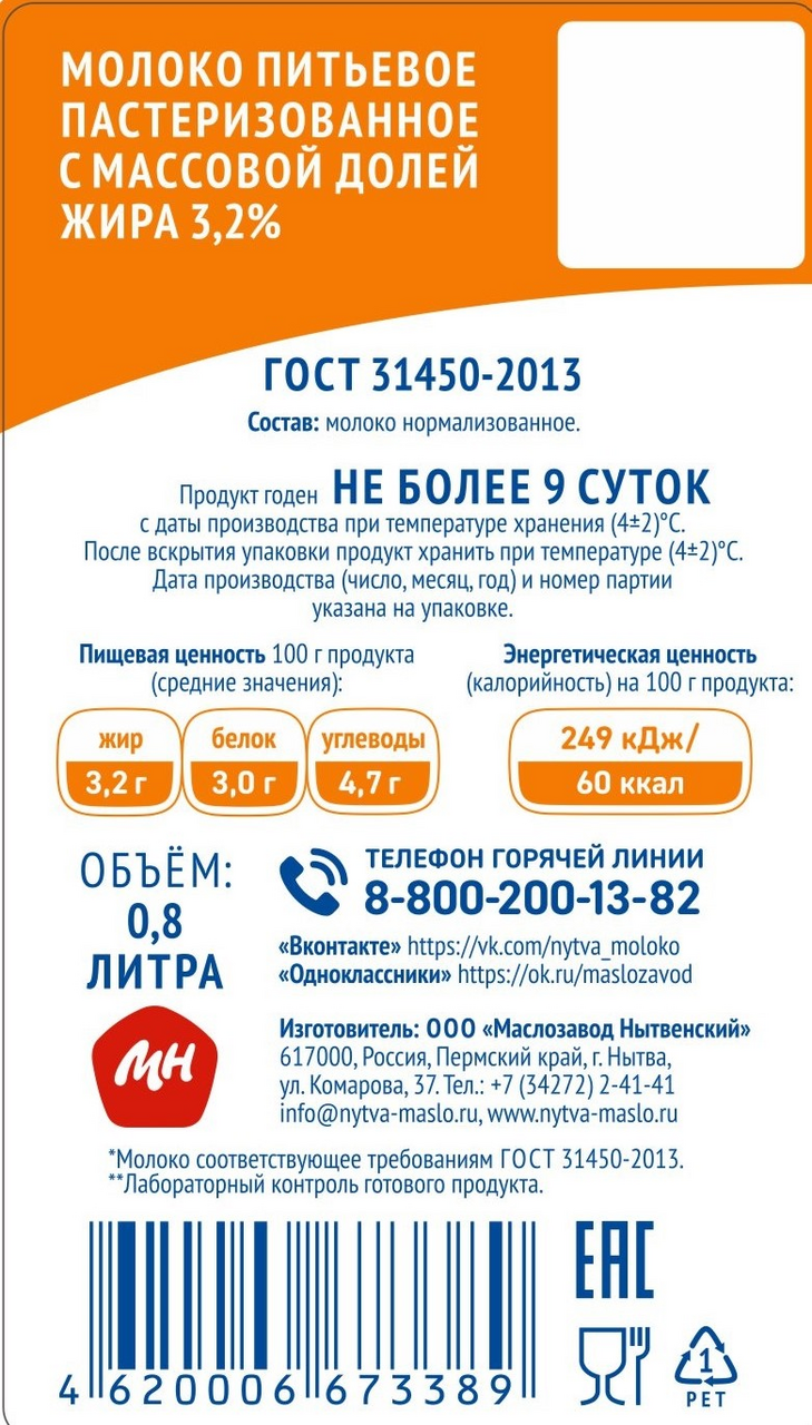 Молоко Маслозавод Нытвенский пастеризованное ГОСТ 3.2%, 800мл