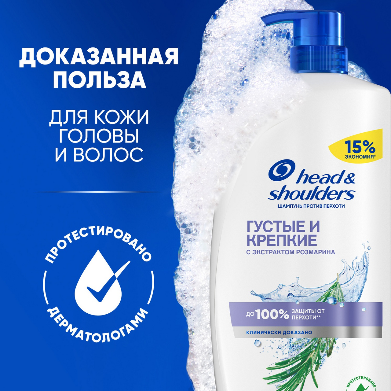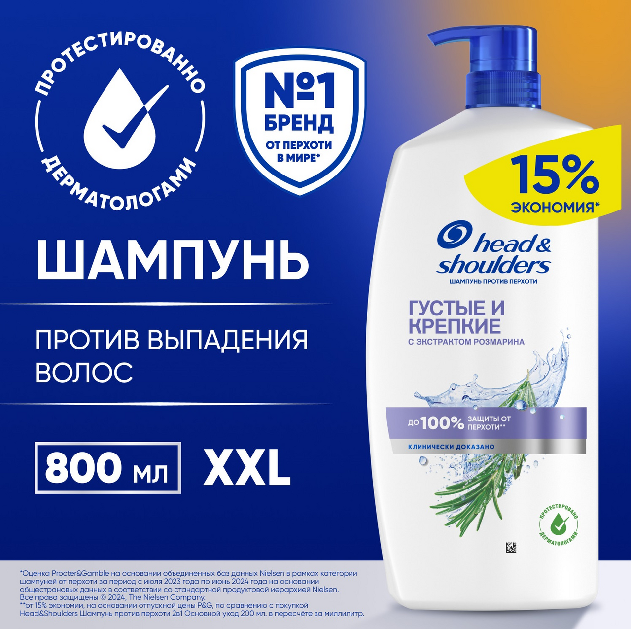 Шампунь против перхоти Head & Shoulders (Хэд энд Шолдерс) Густые и Крепкие с Экстрактом Розмарина против выпадения волос мягко очищает и увлажняет сухую кожу головы и волосы, придавая им великолепный здоровый вид и ощущение свежести. Обеспечивает до 100% защиты от перхоти. Эффективен даже против стойкой перхоти. Экстракт Розмарина способствует стимуляции роста волос, укрепляет их корни и препятствует выпадению волос.Обновленная формула с активным ингредиентом Пироктон Оламином удаляет как видимую, так и невидимую перхоть, доставляя в поры в 2x больше защитных ингредиентов. Клинически проверенная и дерматологически протестированная pH-сбалансированная формула делает волосы и кожу головы чистыми и свежими. Шампунь для женщин для ежедневного использования с формулой Баланса микробиома устраняет основную причину возникновения перхоти и поддерживает сбалансированный микробиом кожи головы. Увлажняющий шампунь для волос уменьшает проблемы и увлажняет кожу головы, избавляя волосы и кожу от перхоти. Для оптимального результата использовать при каждом мытье головы. Способ применения: Нанесите шампунь на волосы. Вспеньте, затем смойте водой.