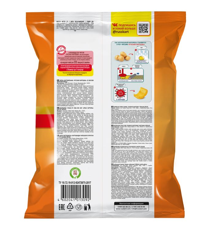 Чипсы Русская картошка со вкусом курицы, 80 г никого не оставят равнодушными. Если подать их к просмотру футбольного матча или любимого фильма, то время пролетит незаметно. Большой упаковки хватит на всю дружную компанию. Единственный минус — чипсы исчезнут очень быстро, поэтому лучше держать про запас еще одну. Хорошо сочетаются со сливочными и острыми соусами, создавая интересный вкусовой тандем. Подавать их можно в качестве закуски к слабоалкогольным напиткам или газировке, а также к горячему чаю или какао. Сочетание с безалкогольными напитками понравится детям, которые попросят добавки. Перед подачей продукт лучше аккуратно пересыпать в стеклянную посуду, чтобы получить удовольствие от насыщенного золотистого цвета. Чипсы производятся из отборного плотного натурального картофеля. Продаются в пакете, сохраняющем вкусовые и потребительские свойства. Он не допускает попадания влаги внутрь и повреждения целостности продукта.