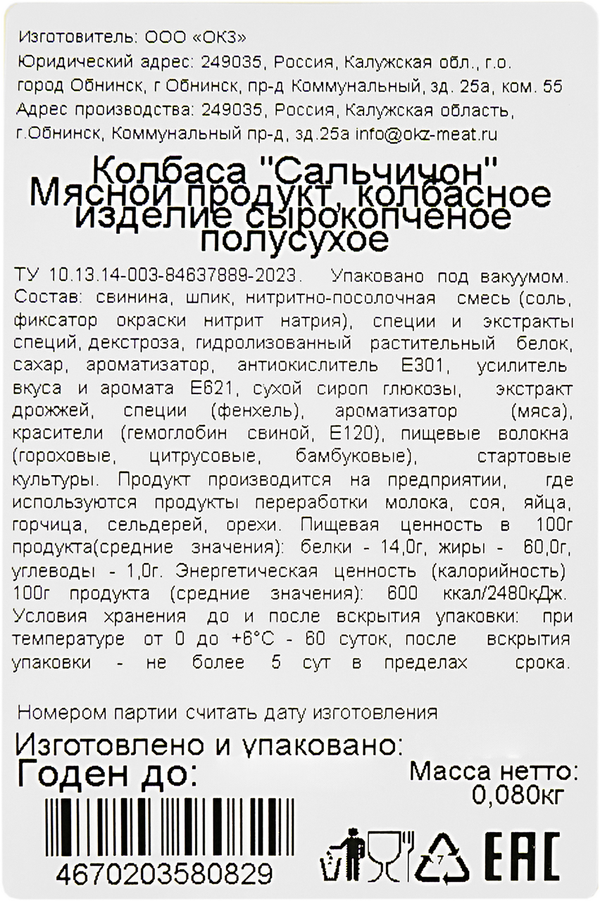 Колбаса Обнинский Сальчичон сырокопченая нарезка, 80г