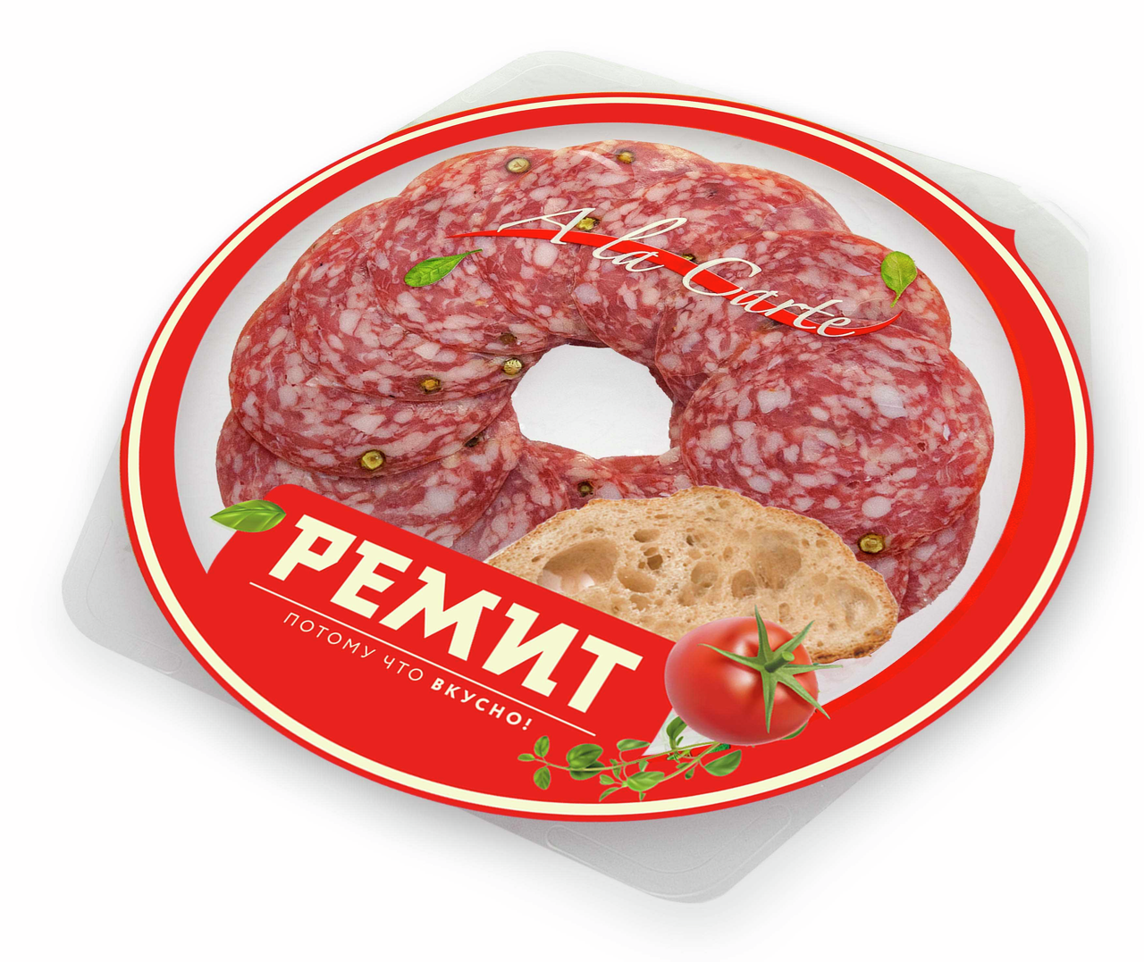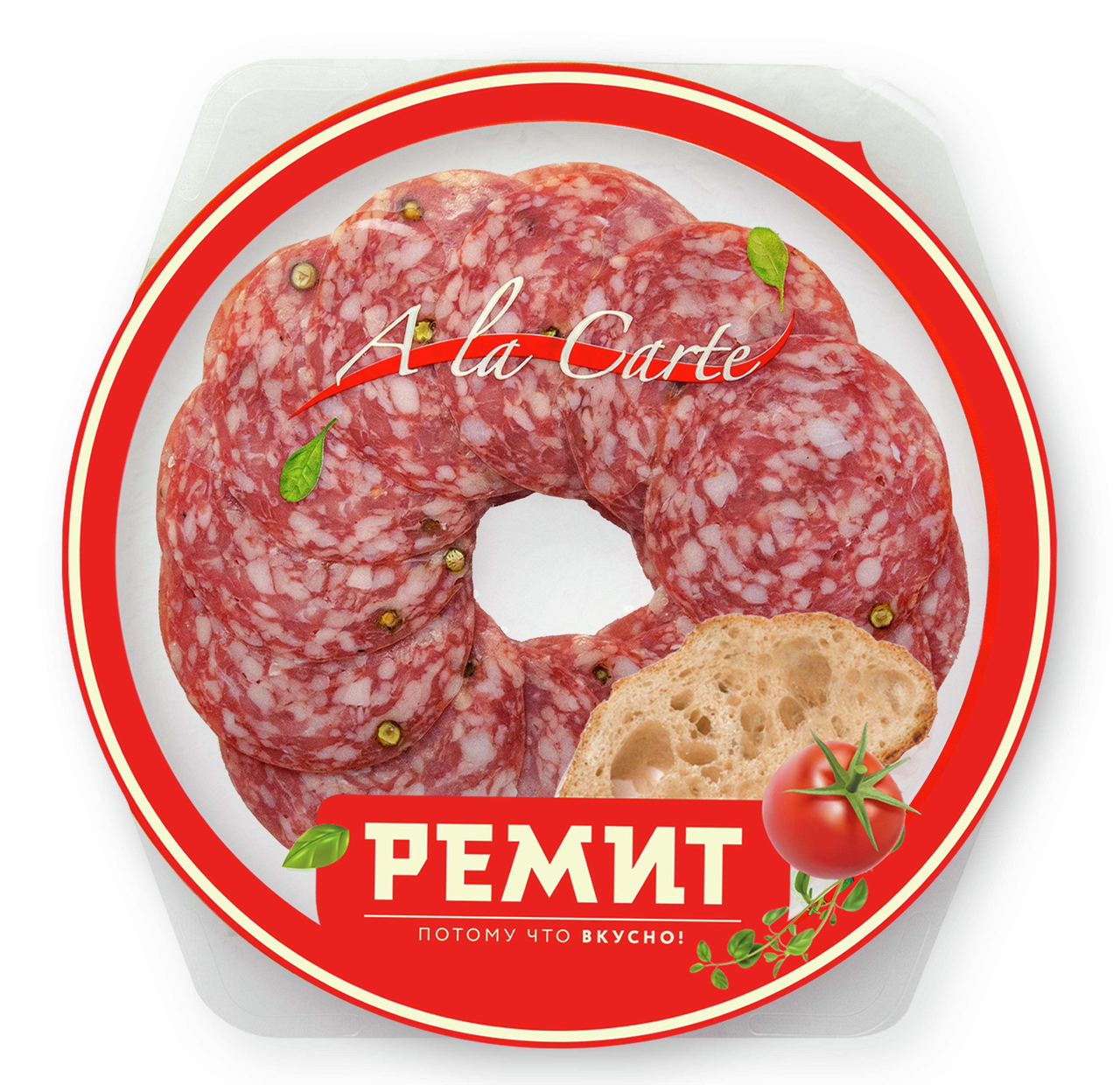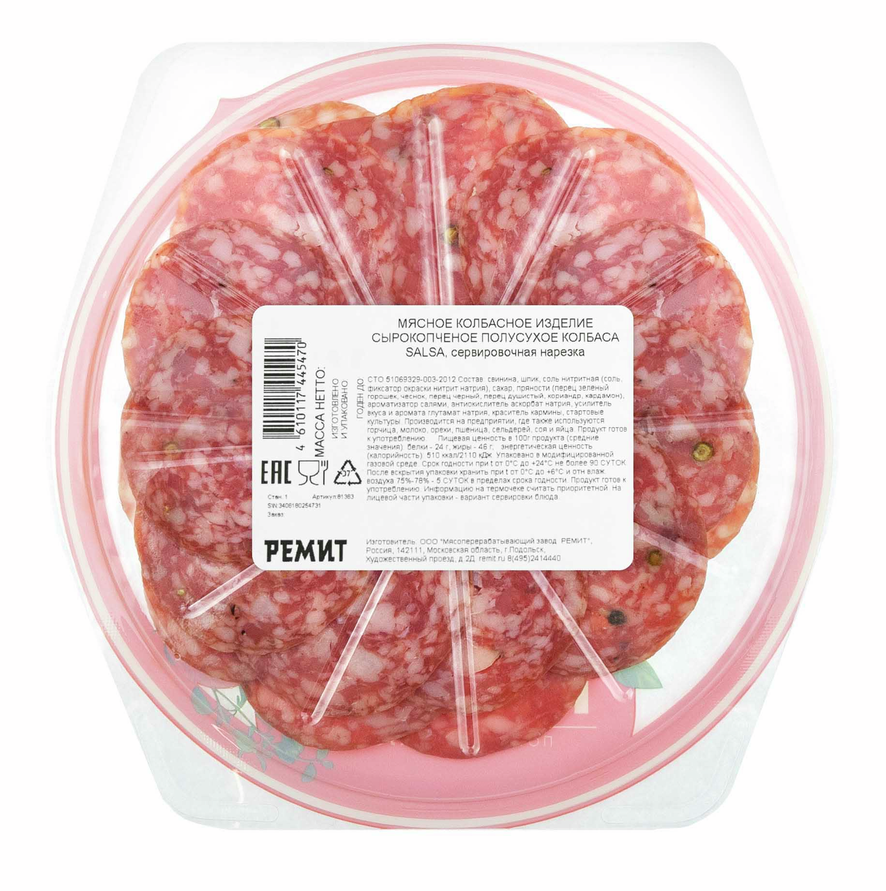 В промышленном масштабе профессионально нарезали, красиво уложили и надежно упаковали вкусную колбаску. Привлекательный формат - эксклюзивная упаковка в форме сервировочной тарелки очень удобна, открывается легко, смотрится красиво. На выездных мероприятиях можно красиво сервировать стол, не вынимая из упаковки, дома легко переложить на красивое блюдо, украсить оливками или кубиками сыра - изысканно, вкусно и просто. Благодаря своему тонкому вкусу и аромату станет прекрасным дополнением к столу. Продукт можно использовать в качестве самостоятельной закуски.