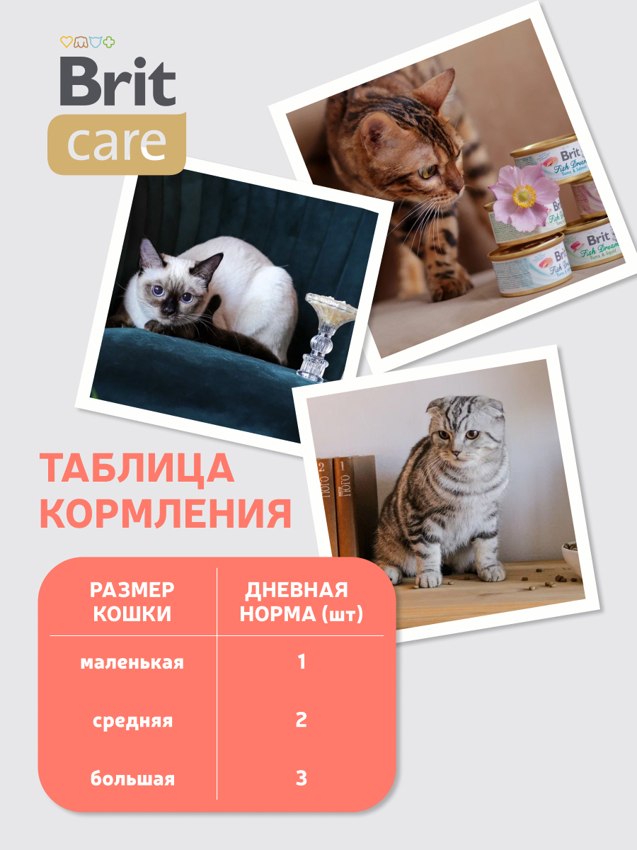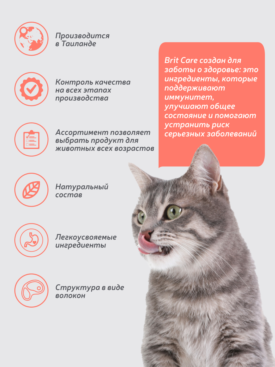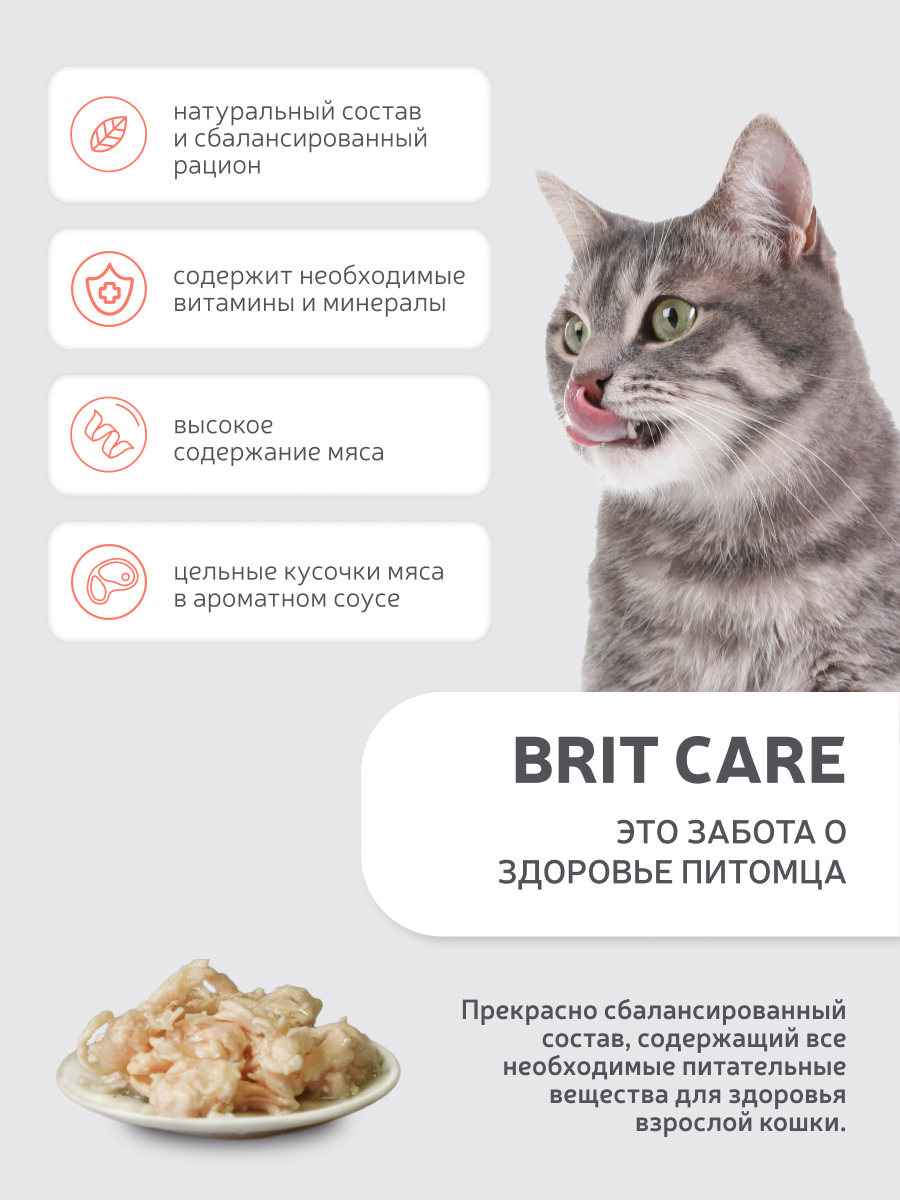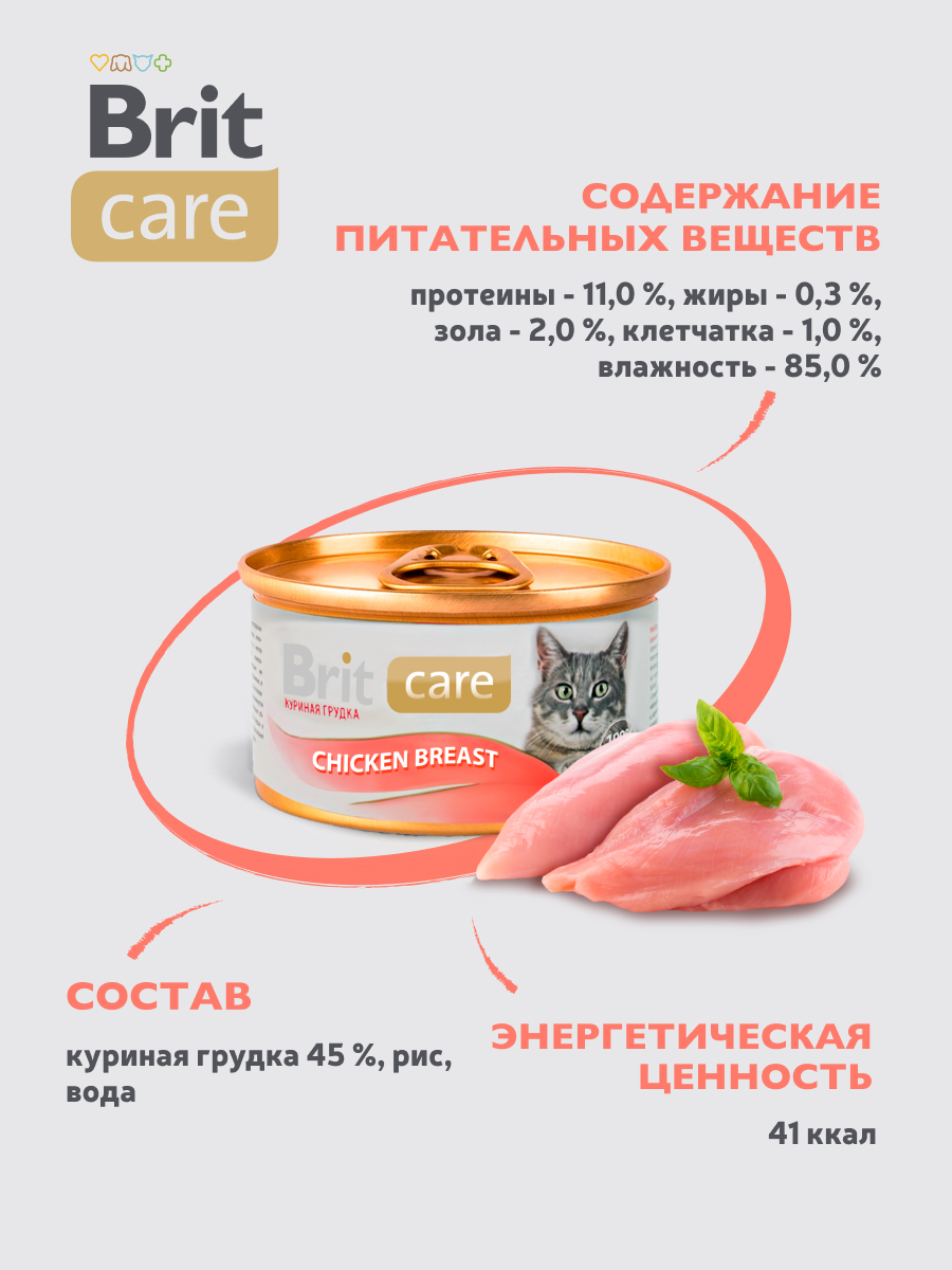 Хорош для кошек с не очень хорошим аппетитом или питомцев-гурманов. Консервы приготовлены из 100% натуральных компонентов, не только вкусные, но и полезные. Они гипоаллергенны и легко усваиваются. Консервы для кошек BRIT Care изготовлены из 100% натуральных компонентов - это не только вкусно, но и полезно. Консервы для кошек Brit Care изготовлены из натуральных, гипоаллергенных и легко усваиваемых компонентов, которые не отягощают организм, и предохраняют от пищевой непереносимости организма. Brit Care способствует образованию благоприятной среды в организме кошки. Brit Care улучшает качество жизни Вашей кошки.