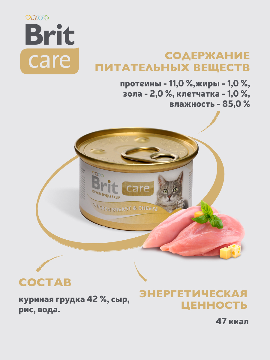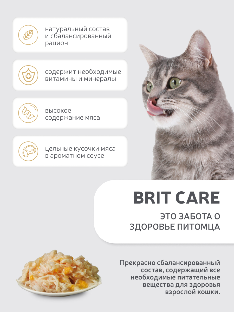 Влажный корм супер премиум класса для кошек. Brit Care производится только из натуральных, гипоаллергенных и легко усваиваемых высокопитательных ингредиентов, которые снижают риск индивидуальной непереносимости пищевых продуктов. Brit Care помогает поддерживать внутренний баланс организма животного, что улучшает качество жизни вашей кошки.