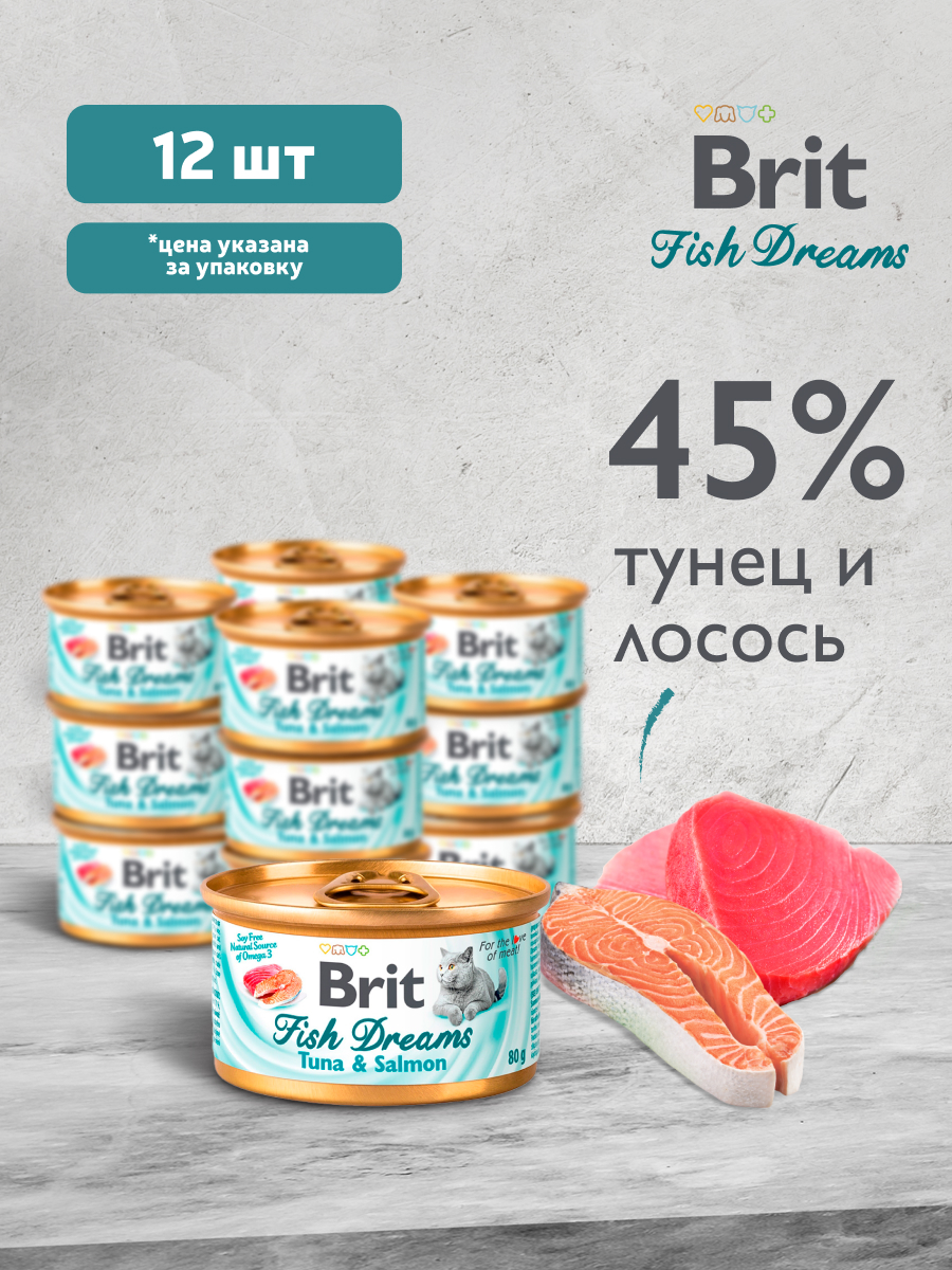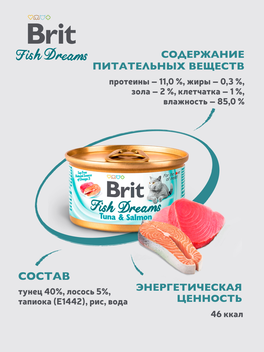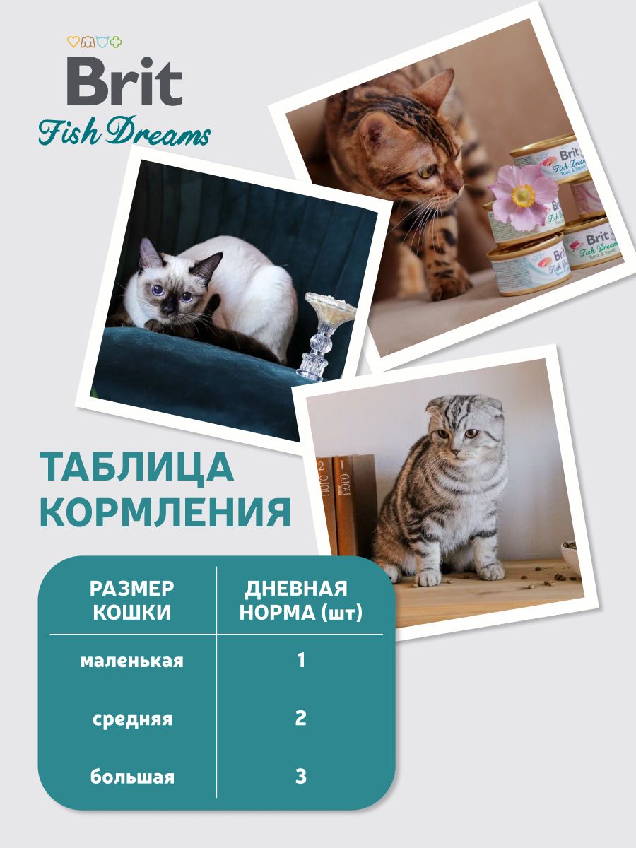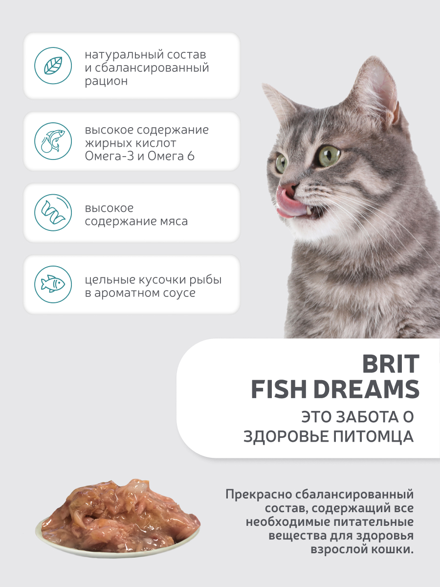 Сбалансированное питание для Вашей кошки. В составе корма содержатся тунец и лосось в натуральном соусе для отличного здоровья, самочувствия и красоты Вашего любимца. Brit Fish Dreams – сбалансированное питание для Вашей кошки. В составе корма содержатся тунец и лосось в натуральном соусе для отличного здоровья, самочувствия и красоты Вашего любимца. Следует давать корм комнатной температуры. Размер порции может отличаться в зависимости от веса кошки. Рекомендуемое ежедневное количество корма представлено в таблице рекомендаций по кормлению. У питомца всегда должен быть свободный доступ к свежей воде.