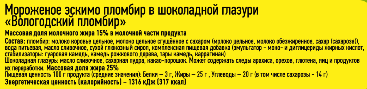 Вологодский пломбир в шоколадной глазури эскимо– настоящий вологодский продукт, произведенный в Вологде, в регионе с легендарными традициями производства молочной продукции. Насыщенный пломбир высокой жирности имеет особенный ярко выраженный вкус в шоколадной глазури, настоящего сливочного масла и свежего молока. Вологодский пломбир абсолютно натурален.