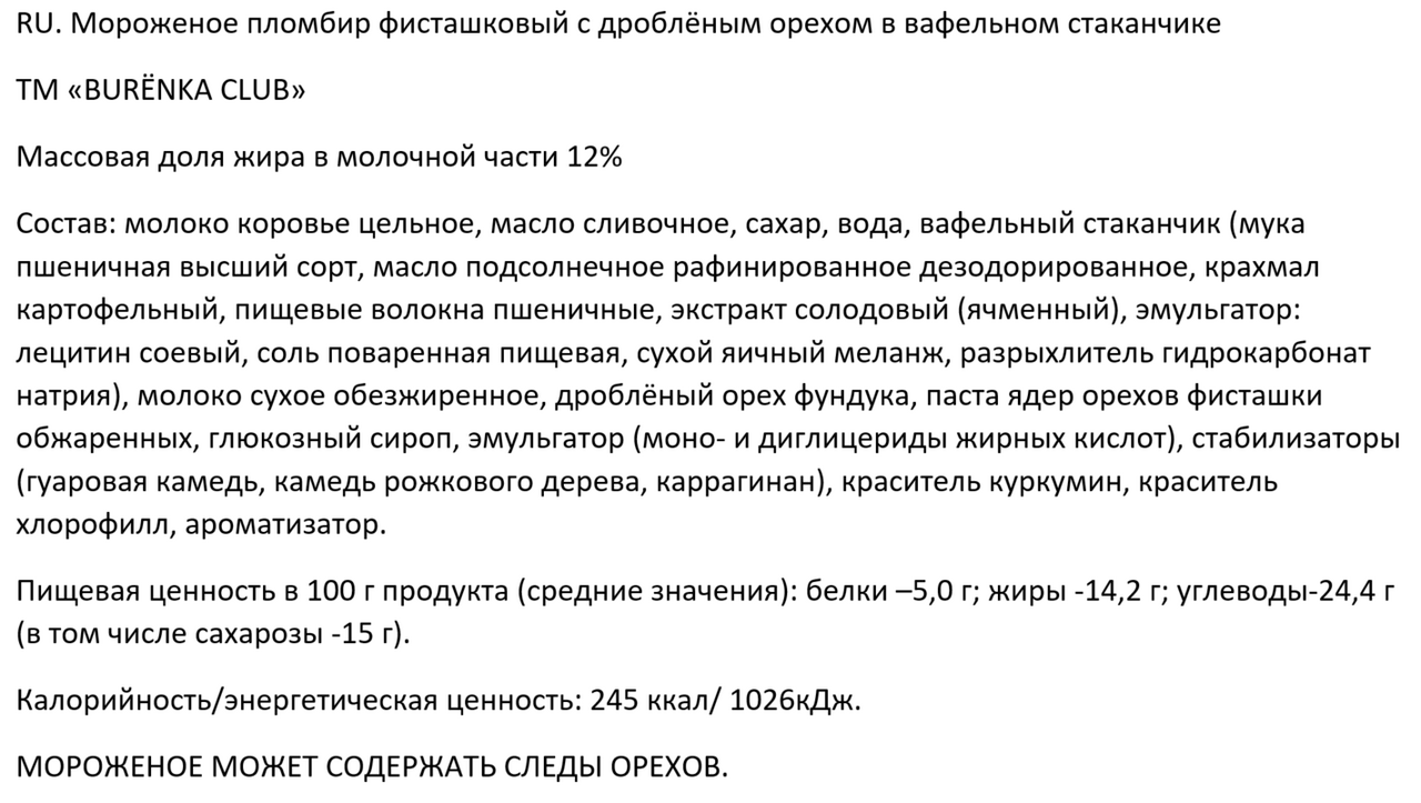 Молоко коровье цельное, масло сливочное, сахар, вода, вафельный стаканчик (мука пшеничная высший сорт, масло подсолнечное рафинированное дезодорированное, крахмал картофельный, пищевые волокна пшеничные, экстракт солодовый (ячменный), эмульгатор: лецитин соевый, соль поваренная пищевая, сухой яичный меланж, разрыхлитель гидрокарбонат натрия), молоко сухое обезжиренное, дроблёный орех фундука, паста ядер орехов фисташки обжаренных, глюкозный сироп, эмульгатор (моно- и диглицериды жирных кислот), стабилизаторы (гуаровая камедь, камедь рожкового дерева, каррагинан), краситель куркумин, краситель хлорофилл, ароматизатор.