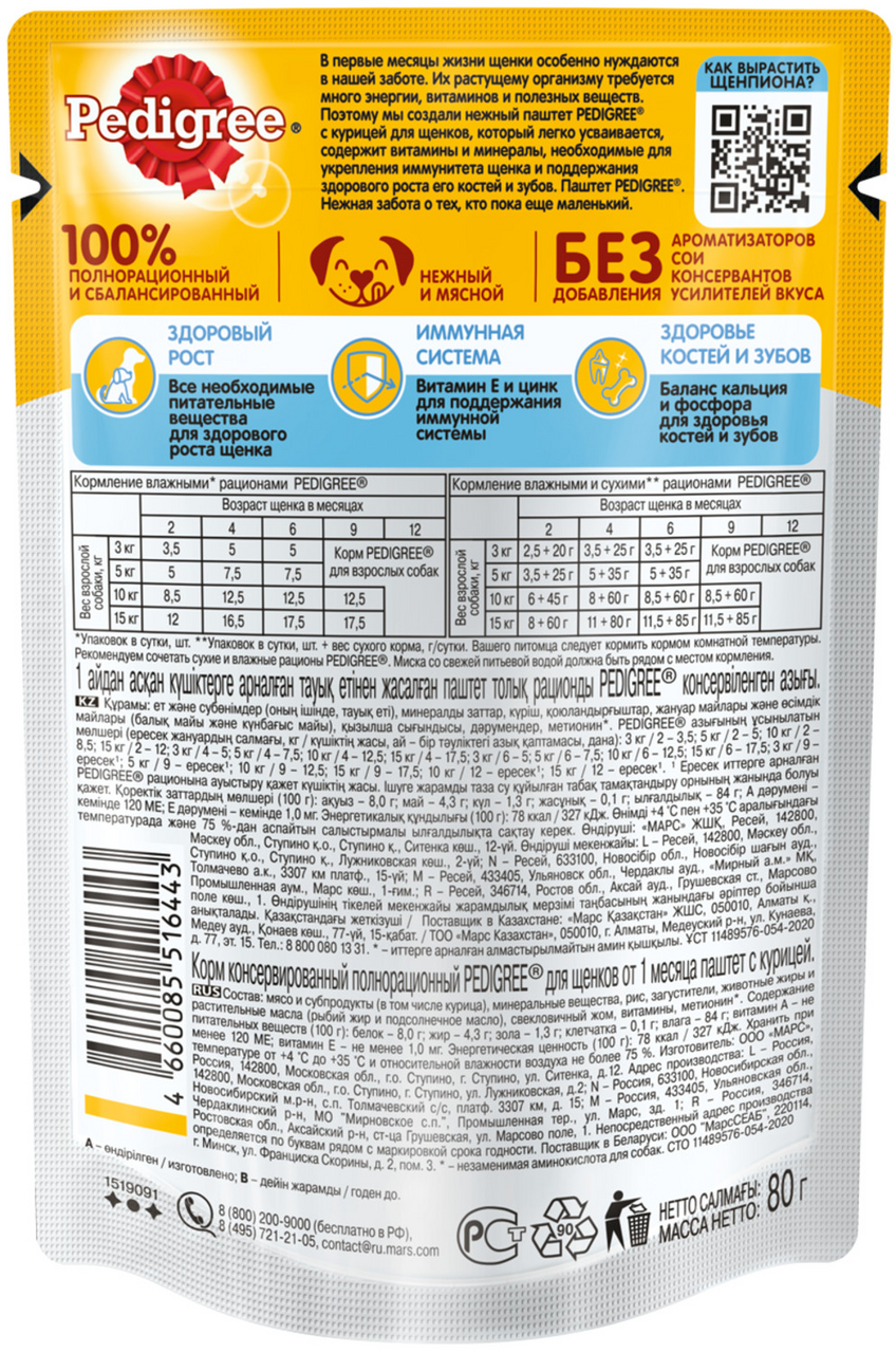 В первые месяцы жизни щенки особенно нуждаются в нашей заботе. Их растущему организму требуется много энергии, витаминов и полезных веществ. Поэтому мы создали нежный паштет PEDIGREE c курицей для щенков, который легко усваивается, содержит витамины и минералы, необходимые для укрепления иммунитета щенка и поддержания здорового роста.