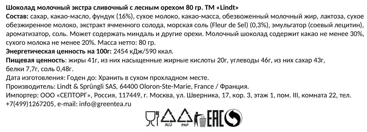 Шоколад Lindt Экстра сливочный молочный с лесным орехом, 80г