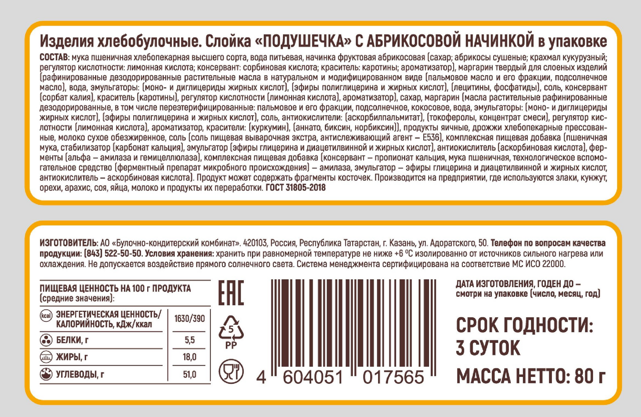 Мука пшеничная хлебопекарная высшего сорта, вода питьевая, начинка фруктовая абрикосовая сахар; абрикосы сушеные; крахмал кукурузный; регулятор кислотности: лимонная кислота; консервант: сорбиновая кислота; краситель: каротины; ароматизатор, маргарин твердый для слоеных изделий рафинированные дезодорированные растительные масла в натуральном и модифицированном виде пальмовое масло и его фракции, подсолнечное масло, вода, эмульгаторы: моно- и диглицериды жирных кислот, эфиры полиглицерина и жирных кислот, лецитины, фосфатиды, соль, консервант сорбат калия, краситель каротины, регулятор кислотности лимонная кислота, ароматизатор, сахар, маргарин масла растительные рафинированные дезодорированные, в том числе переэтерифицированные: пальмовое и его фракции, подсолнечное, кокосовое, вода, эмульгаторы: моно- и диглицериды жирных кислот, эфиры полиглицерина и жирных кислот, соль, антиокислители: аскорбилпальмитат, токоферолы, концентрат смеси, регулятор кислотности лимонная кислота, ароматизатор, красители: куркумин, аннато, биксин, норбиксин, продукты яичные, дрожжи хлебопекарные прессованные, молоко сухое обезжиренное, соль соль пищевая выварочная экстра, антислеживающий агент – Е536, комплексная пищевая добавка пшеничная мука, стабилизатор карбонат кальция, эмульгатор эфиры глицерина и диацетилвинной и жирных кислот, антиокислитель аскорбиновая кислота, ферменты альфа – амилаза и гемицеллюлаза, комплексная пищевая добавка консервант - пропионат кальция, мука пшеничная, технологическое вспомогательное средство ферментный препарат микробного происхождения – амилаза, эмульгатор – эфиры глицерина и диацетилвинной и жирных кислот, антиокислитель – аскорбиновая кислота.