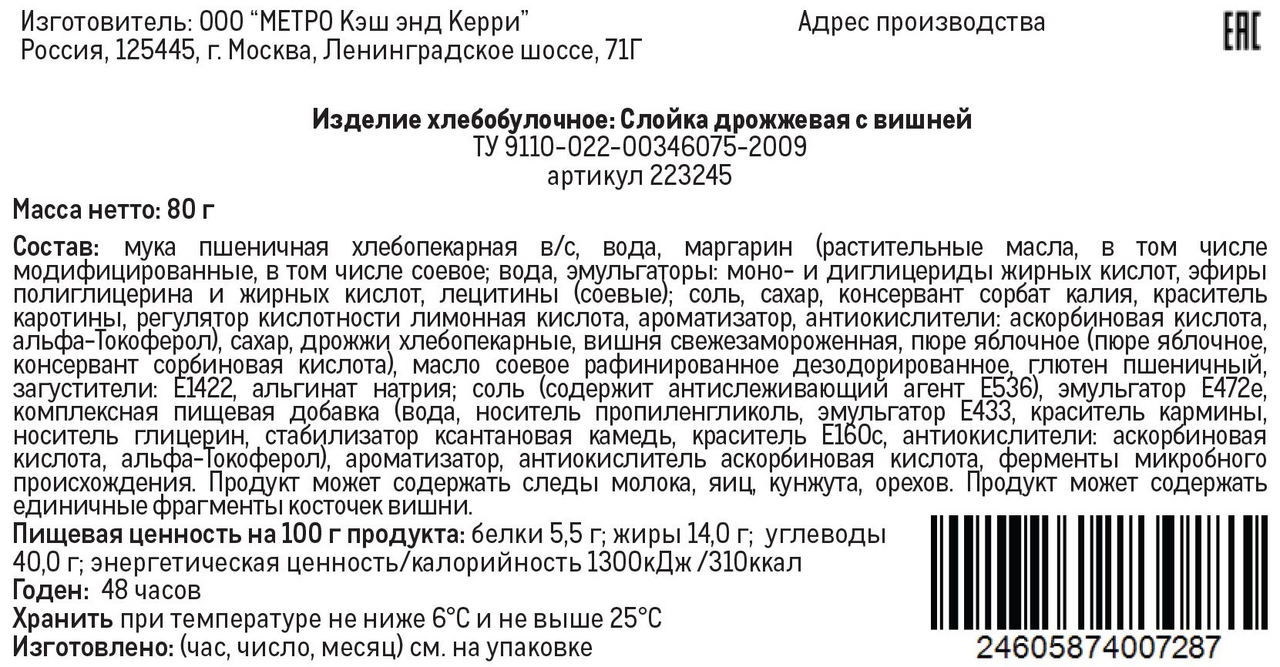 Мука пшеничная хлебопекарная в/с, вода, маргарин (растительные масла, в том числе модифицированные, в том числе соевое; вода, эмульгаторы: моно- и диглицериды жирных кислот, эфиры полиглицерина и жирных кислот, лецитины (соевые); соль, сахар, консервант сорбат калия, краситель каротины, регулятор кислотности лимонная кислота, ароматизатор, антиокислители: аскорбиновая кислота, альфа-Токоферол), сахар, дрожжи хлебопекарные, вишня свежезамороженная, пюре яблочное (пюре яблочное, консервант сорбиновая кислота), масло соевое рафинированное дезодорированное, глютен пшеничный, загустители: Е1422, альгинат натрия; соль (содержит антислеживающий агент Е536), эмульгатор Е472е, комплексная пищевая добавка (вода, носитель пропиленгликоль, эмульгатор Е433, краситель кармины, носитель глицерин, стабилизатор ксантановая камедь, краситель Е160с, антиокислители: аскорбиновая кислота, альфа-Токоферол), ароматизатор, антиокислитель аскорбиновая кислота, ферменты микробного происхождения. Продукт может содержать следы молока, яиц, кунжута, орехов. Продукт может содержать единичные фрагменты косточек вишни.