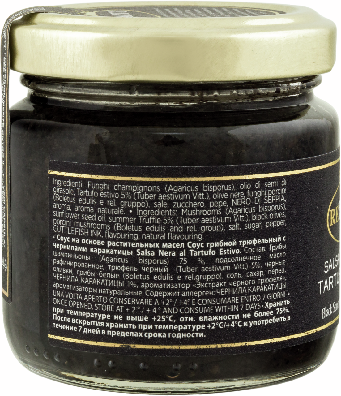Соус из черного трюфеля (5% летнего трюфеля) с добавлением чернил каракатицы, шампиньонов и белых грибов — самый элегантный трюфельный соус. Имеет яркий черный цвет и сочетает в себе чрезвычайно захватывающий визуальный эффект и выразительный вкус. Он идеально подходит для приготовления пасты, ризотто, пиццы. Используется в качестве приправы для бутербродов и начинок для закусок. Соус грибной трюфельный с чернилами каракатицы идеально подходит в качестве приправы для бутербродов и начинок для закусок, первых и вторых блюд. Соус можно использовать холодным на поджаренном хлебе или в качестве соуса для макарон или риса.