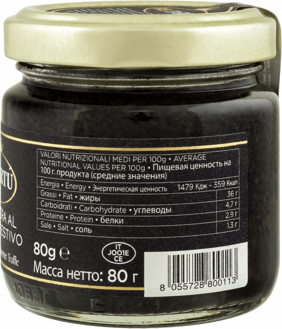 Грибы шампиньоны (Agaricus bisporus) 75 %, подсолнечное масло, трюфель черный (Tuber aestivum Vitt.) 5%, черные оливки, грибы белые (Boletus edulis e rel.gruppo), соль, сахар, перец, чернила каракатицы 1%, ароматизатор Экстракт черного трюфеля