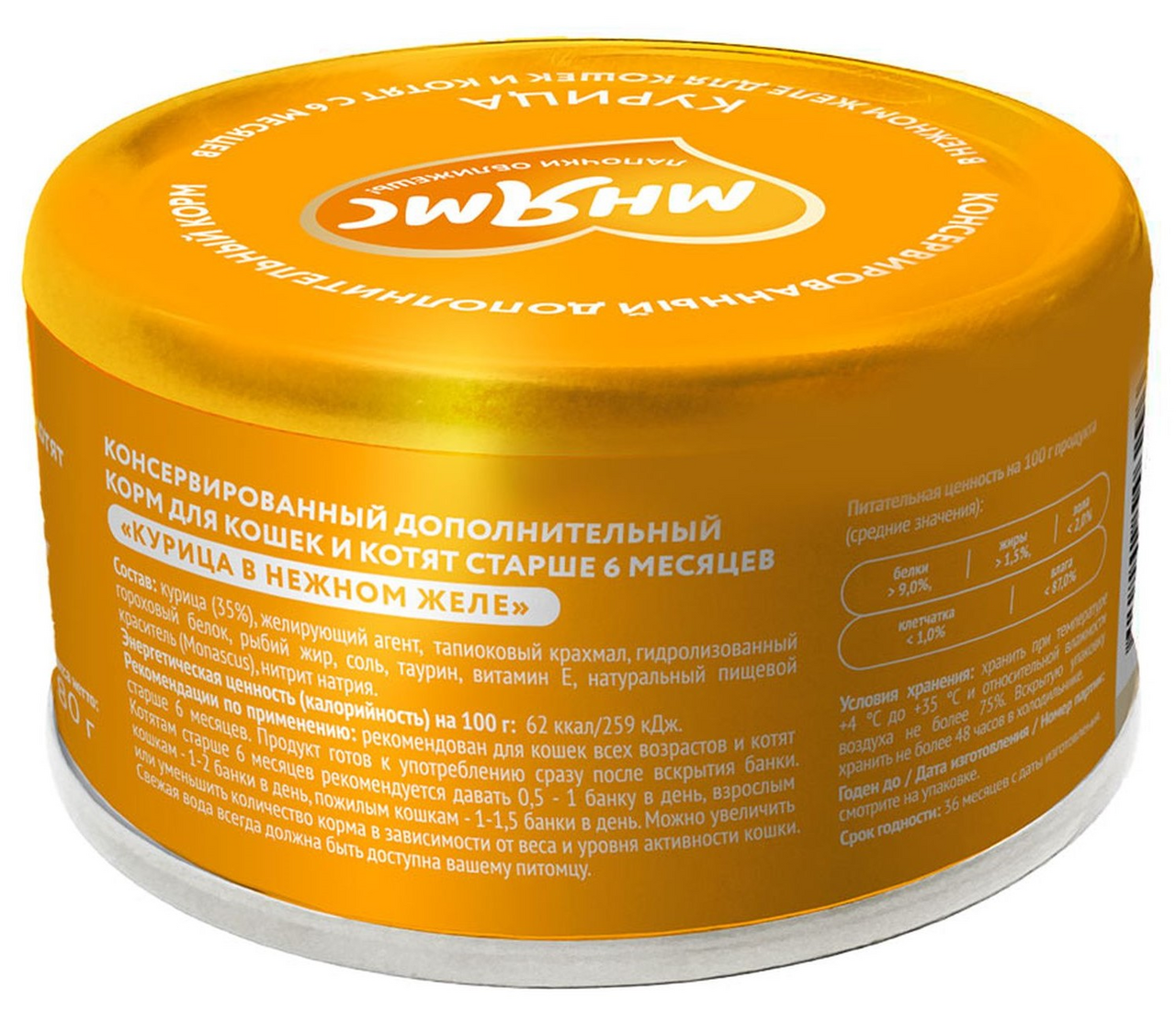 Корм Курица в нежном желе рекомендуется использовать в качестве дополнительного источника питания к основному рациону вашей кошки. Содержит в составе натуральное мясо курицы, которое хорошо усваивается организмом и имеет высокую питательную ценность и вкусовую привлекательность. Корм Курица в нежном желе рекомендуется использовать в качестве дополнительного источника питания к основному рациону вашей кошки. При этом важно учитывать индивидуальные потребности животного, включая его вес, возраст и уровень активности. Котятам старше 6 месяцев рекомендуется давать - 40-80г в день, взрослым кошкам - 80-160г в день, пожилым кошкам - 80-120г в день. Свежая вода всегда должна быть доступна вашему питомцу. Прекрасно подходит привередливым кошкам, а также питомцам со сниженным потреблением воды. Мнямс консервированный дополнительный корм для кошек и котят старше 6 месяцев Курица в нежном желе гарантирует, что ваш питомец получит только качественный и вкусный продукт, который прекрасно разнообразит его рацион, поддержит здоровье и обеспечит энергией.