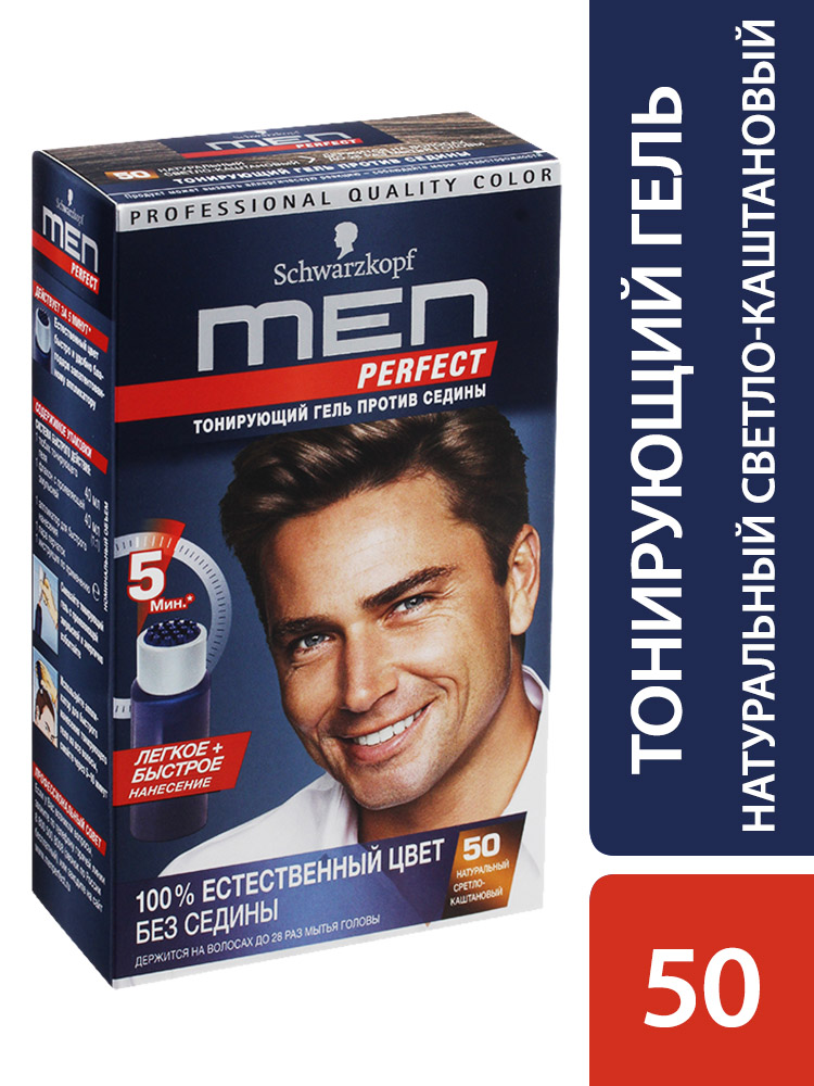 Гель тонирующий Schwarzkopf Men Perfect 50 натуральный светло-каштановый, 80мл - ухаживающий тонирующий гель, разработанный специально для мужчин, который позволяет естественным образом скрыть первую седину. формула геля соответствует исходному натуральному цвету ваших волос, делая факт окрашивания незаметным для окружающих. естественный цвет волос без седины продержится до 24 раз мытья головы.