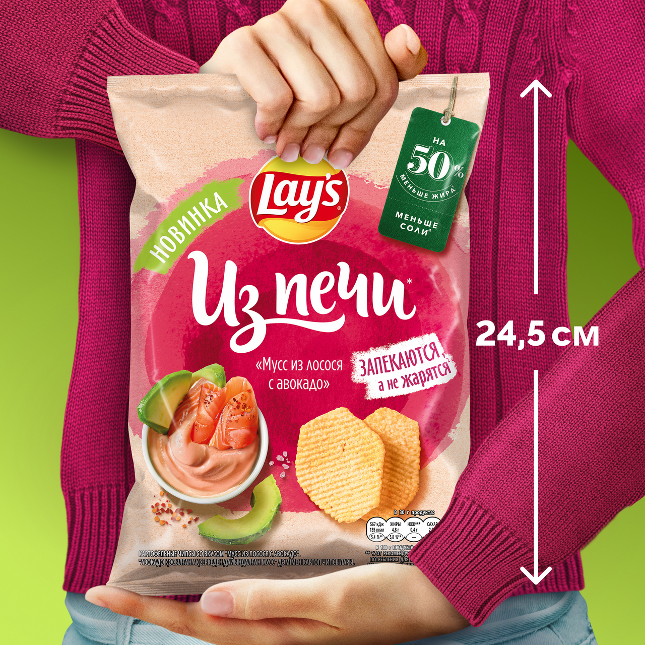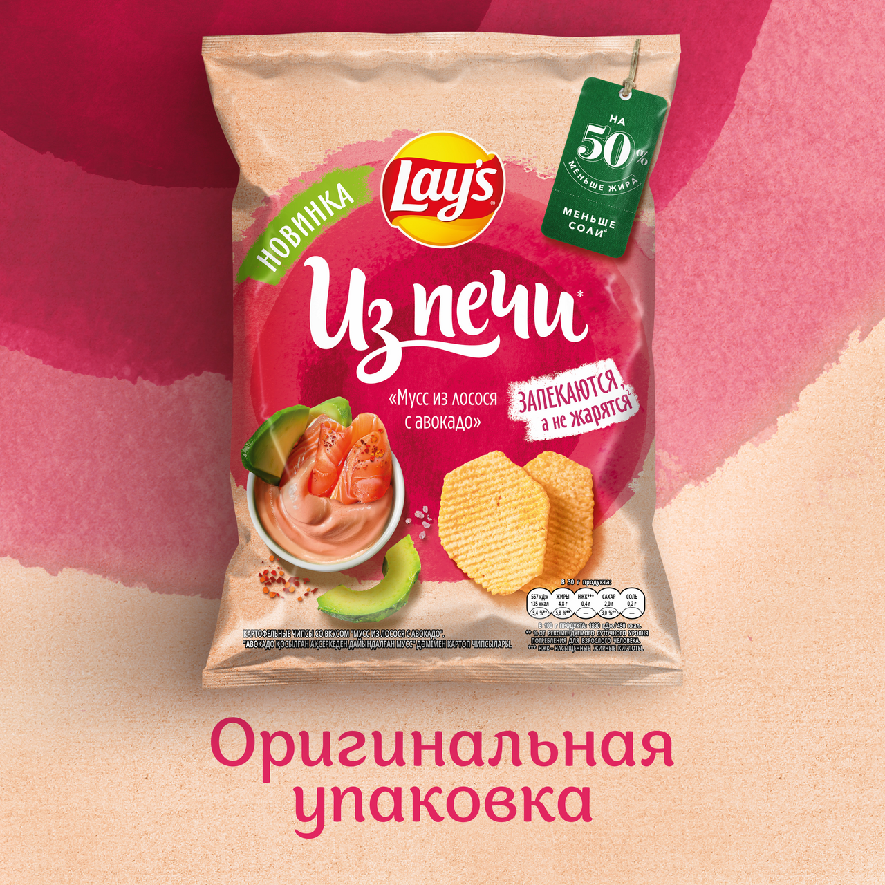Lay's - чипсы, каждая пачка которых изготовлена из специально отобранного картофеля и соответствует самым высоким стандартам качества. Хрустящие и легкие на вкус картофельные чипсы Lay's были созданы, чтобы вызвать улыбку на лице каждого человека, поэтому ими так приятно делиться с лучшими друзьями. Чипсы Lay's, несомненно, скрасят ваш день. Приготовлены путем запекания, а не обжаривания, поэтому в них на 50% меньше жира. Запекание придает чипсам аппетитный хруст, а так же они имеют особенный, неповторимый вкус. Lay’s Из Печи Мусс из лосося с авокадо без добавления усилителей вкуса и содержит меньше соли.