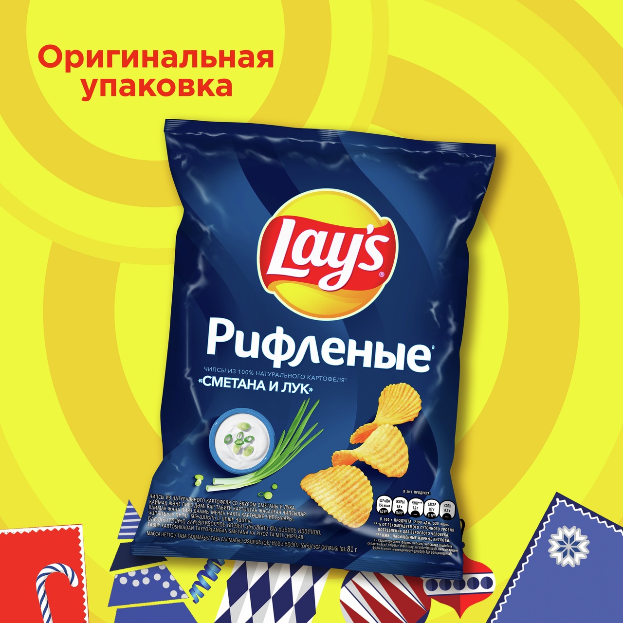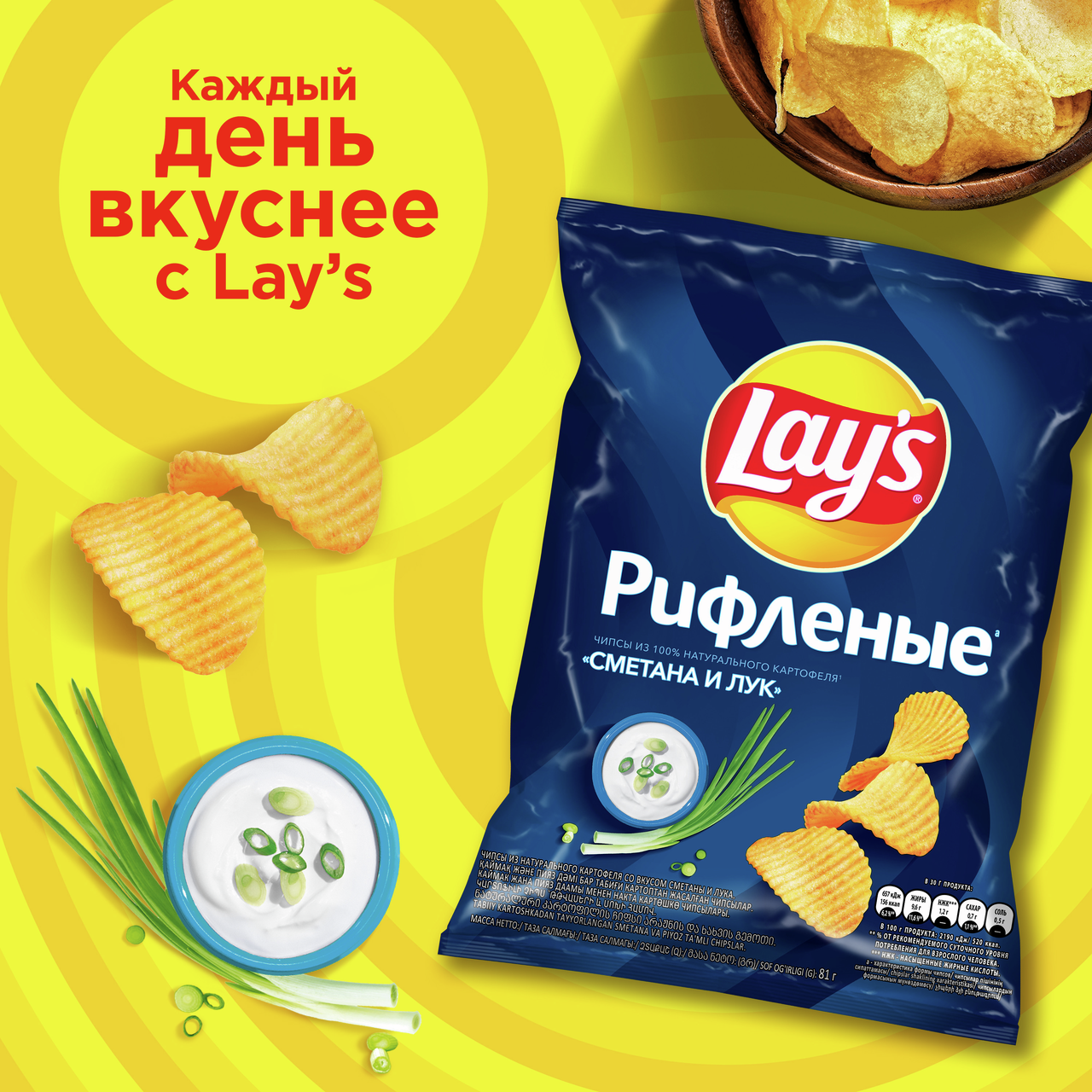 LAY'S— чипсы, каждая пачка которых изготовлена изспециально отобранного картофеля исоответствует самым высоким стандартам качества. Хрустящие илегкие навкус картофельные чипсы LAY'Sбыли созданы, чтобы вызвать улыбку налице каждого человека, поэтому ими так приятно делиться случшими друзьями. Чипсы LAY'S, несомненно, скрасят ваш день!