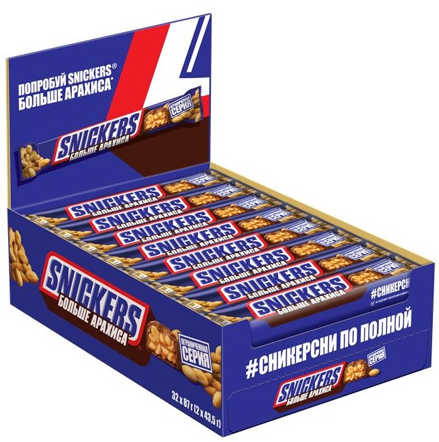 Зарядись еще больше с шоколадным батончиком Snickers Больше арахиса. Сочетание молочного шоколада, карамели и увеличенного содержания жареного арахиса поможет справиться даже с сильным приступом голода. Шоколадный батончик удобно брать с собой в дорогу, как перекус на работу и на учебу. Поставь дела на паузу, устрой вкусный перерыв или ешь Snickers Больше арахиса на ходу, не отрываясь от дел.