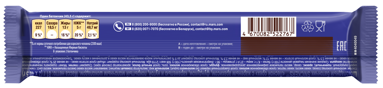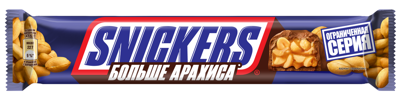 Батончик шоколадный Snickers Больше арахиса, 81г x 32 шт - зарядись еще больше с шоколадным батончиком Snickers Больше арахиса. Сочетание молочного шоколада, карамели и увеличенного содержания жареного арахиса поможет справиться даже с сильным приступом голода. Шоколадный батончик удобно брать с собой в дорогу, как перекус на работу и на учебу. Поставь дела на паузу, устрой вкусный перерыв или ешь Snickers Больше арахиса на ходу, не отрываясь от дел.