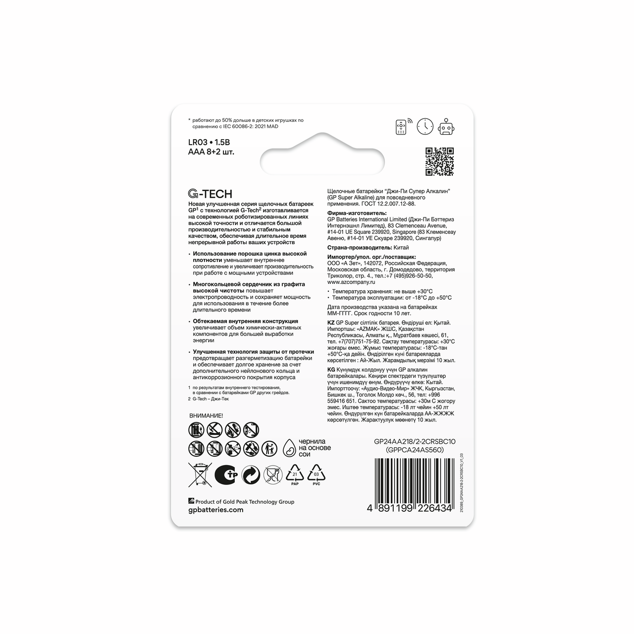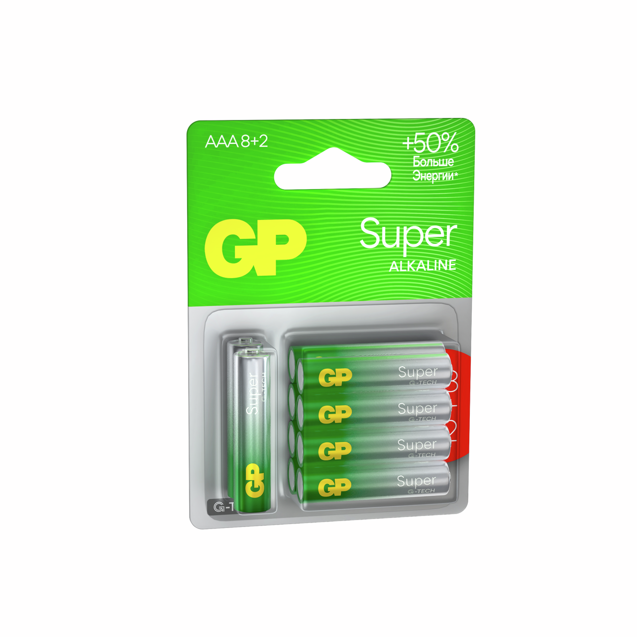 Комплект из 10-ти алкалиновых батареек GP типоразмера ААА позволит решить проблему с источниками питания в путешествиях, в бытовых условиях, на даче. Будет полезен там, где используется большое количество приборов с повышенным энергопотреблением. Батареи подходят для использования в портативных радиоприемниках или радиостанциях, в осветительных приборах, игрушках с электронными элементами. Комплект источников питания GP является идеальным по соотношению цена/качество". Технология низкого саморазряда батарей GP позволяет сохранять номинальную мощность при длительном хранении. Усовершенствованный щелочной электролит в виде марганцево-цинкового наполнителя обеспечивает стабильную и длительную энергоотдачу по сравнению с обычными солевыми батарейками. Алкалиновые батарейки GP используются в широком температурном диапазоне: -30 до +50C. Соответственно, вы будете всегда обеспечены надежными и безотказными источниками энергии.