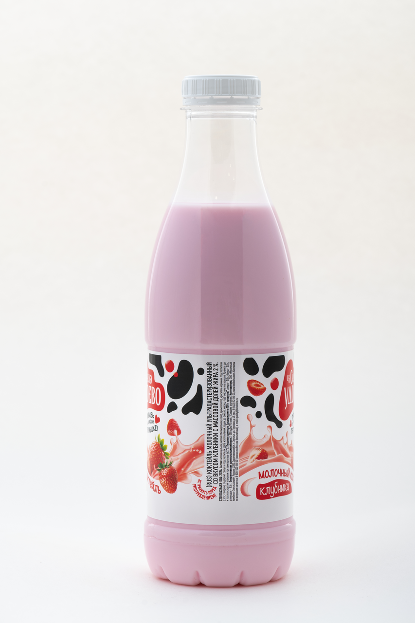 Коктейль молочный Из села Удоево Клубничный приготовлен из натурального молока, отличается ярким вкусом клубники. Коктейль в большой бутылке с крышкой можно разделить с близкими. Яркий напиток может стать отличным вариантом десерта и подойдет для вкусного перекуса тем, кто ценит простые радости. Отлично подходит для перекуса, удобно брать с собой.