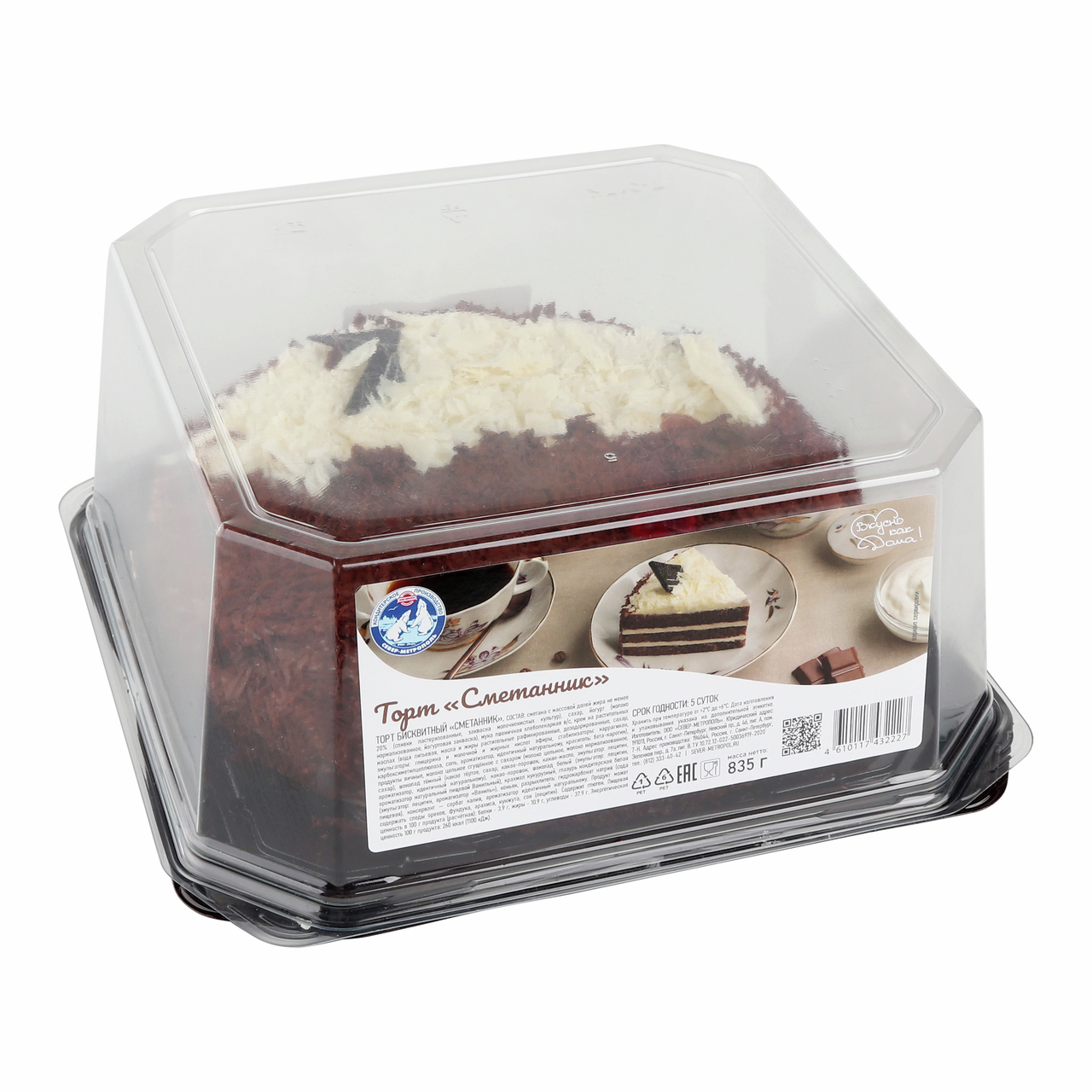 Торт нарезной из трех слоёв сметанного бисквита, пропитанных сиропом и прослоенных сметано-сливочным кремом. Поверхность посыпается стружкой из натурального тёмного шоколада. Пластиковая упаковка надежно сохраняет свежесть и презентабельный внешний вид продукта в течение всего срока годности.