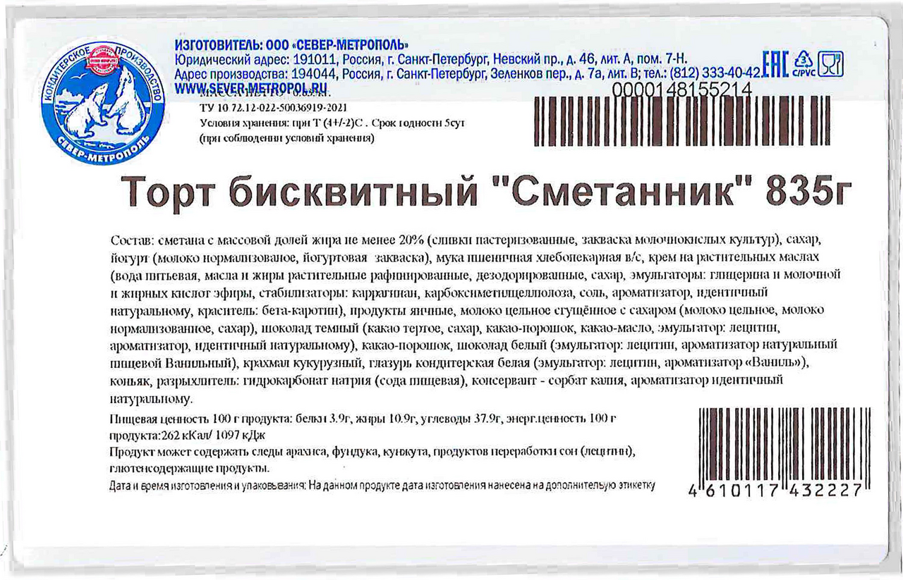 Торт Сметанник Север бисквитный, 835г