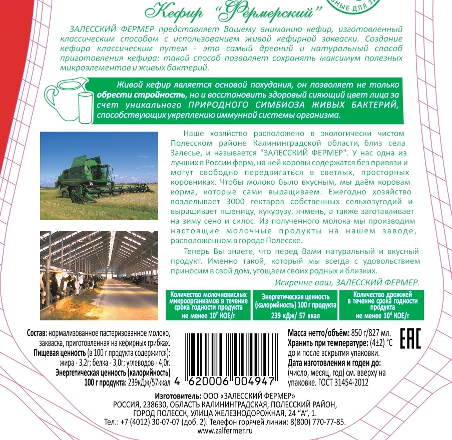Кефир Залесский фермер Фермерский натуральный 3.2%, 850г - это 100% натуральный кисломолочный продукт, который производится по классическому старинному рецепту из пастеризованного молока и закваски на живых кефирных грибках. Полезные бактерии нормализуют кишечную микрофлору, способствуют хорошему пищеварению и нормализуют обмен веществ. Бутылочка такого кефира заменит вам здоровый перекус или легкий ужин. Все сырье поставляется на завод с собственных животноводческих комплексов компании в Калининградской области.