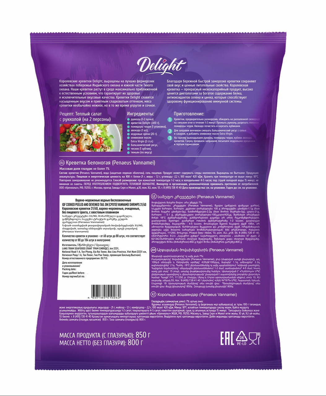 Королевские креветки Delight выращивают в среде максимально приближенной к естественным условиям, что гарантирует их здоровье и исключительные вкусовые качества. Креветки Delight славятся насыщенным вкусом с приятным сладковатым оттенком, мясо креветки необычайно нежное, но в то же время упругое и сочное. Благодаря бережной быстрой заморозке креветки сохраняют свой вкус и ценные питательные свойства.
