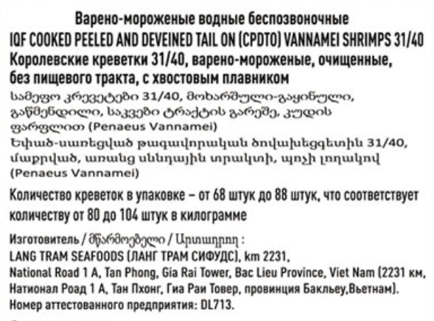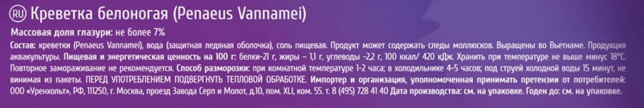 Креветки (Penaeus Vannamei), вода (защитная ледяная оболочка), соль пищевая.