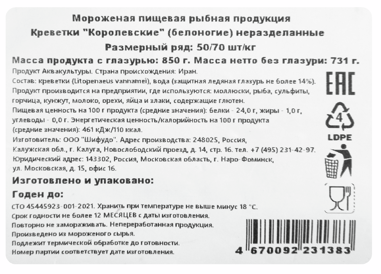 Креветки королевские (белоногие) неразделанные свежемороженые 50/70, 850г