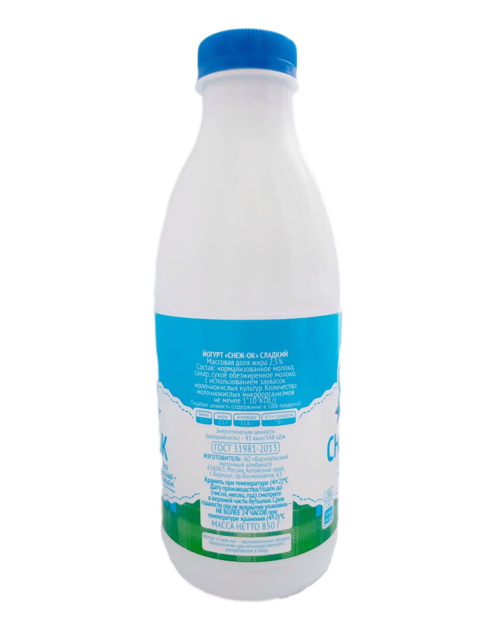 Снежок Молочная сказка 2,5%, 850 г БЗМЖ (без заменителя молочного жира) - питательный, полезный и вкусный кисломолочный продукт, который станет прекрасным дополнением завтрака, полдника, перекуса. Снежок отличается сладковатым сливочным вкусом, средней густоты консистенцией. Он хорошо сочетается с печеньем, выпечкой, различными десертами, поджаренными тостами, хлебцами. Продукт находится в удобной упаковке, благодаря чему ее комфортно брать с собой, она не занимает много места в холодильнике или сумке. Этот кисломолочный продукт прекрасно утоляет голод. Он не вызывая чувства тяжести и вздутия.