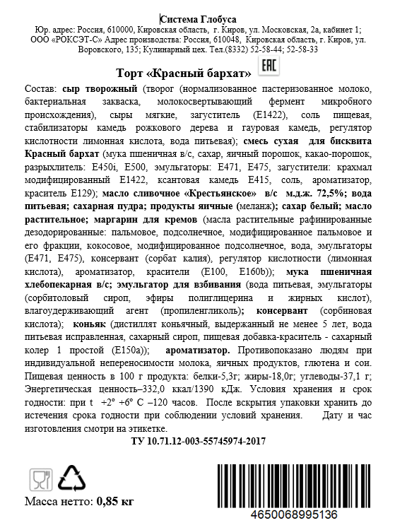 Сыр творожный творог нормализованное пастеризованное молоко, бактериальная закваска, молокосвертывающий фермент микробного происхождения, сыры мягкие, загуститель Е1422, соль пищевая, стабилизаторы камедь рожкового дерева и гауровая камедь, регулятор кислотности лимонная кислота, вода питьевая; смесь сухая для бисквита Красный бархат мука пшеничная в/с, сахар, яичный порошок, какао-порошок, разрыхлитель: Е450i, Е500, эмульгаторы: Е471, Е475, загустители: крахмал модифицированный Е1422, ксантовая камедь Е415, соль, ароматизатор, краситель Е129; масло сливочное Крестьянское в/с м. д. ж. 72,5% ; вода питьевая; сахарная пудра; продукты яичные меланж; сахар белый; масло растительное; маргарин для кремов масла растительные рафинированные дезодорированные: пальмовое, подсолнечное, модифицированное пальмовое и его фракции, кокосовое, модифицированное подсолнечное, вода, эмульгаторы Е471, Е475, консервант сорбат калия, регулятор кислотности лимонная кислота, ароматизатор, красители Е100, Е160b; мука пшеничная хлебопекарная в/с; эмульгатор для взбивания вода питьевая, эмульгаторы сорбитоловый сироп, эфиры полиглицерина и жирных кислот, влагоудерживающий агент пропиленгликоль; консервант сорбиновая кислота; коньяк дистиллят коньячный, выдержанный не менее 5 лет, вода питьевая исправленная, сахарный сироп, пищевая добавка-краситель - сахарный колер 1 простой Е150а; ароматизатор. Противопоказано людям при индивидуальной непереносимости молока, яичных продуктов, глютена и сои.