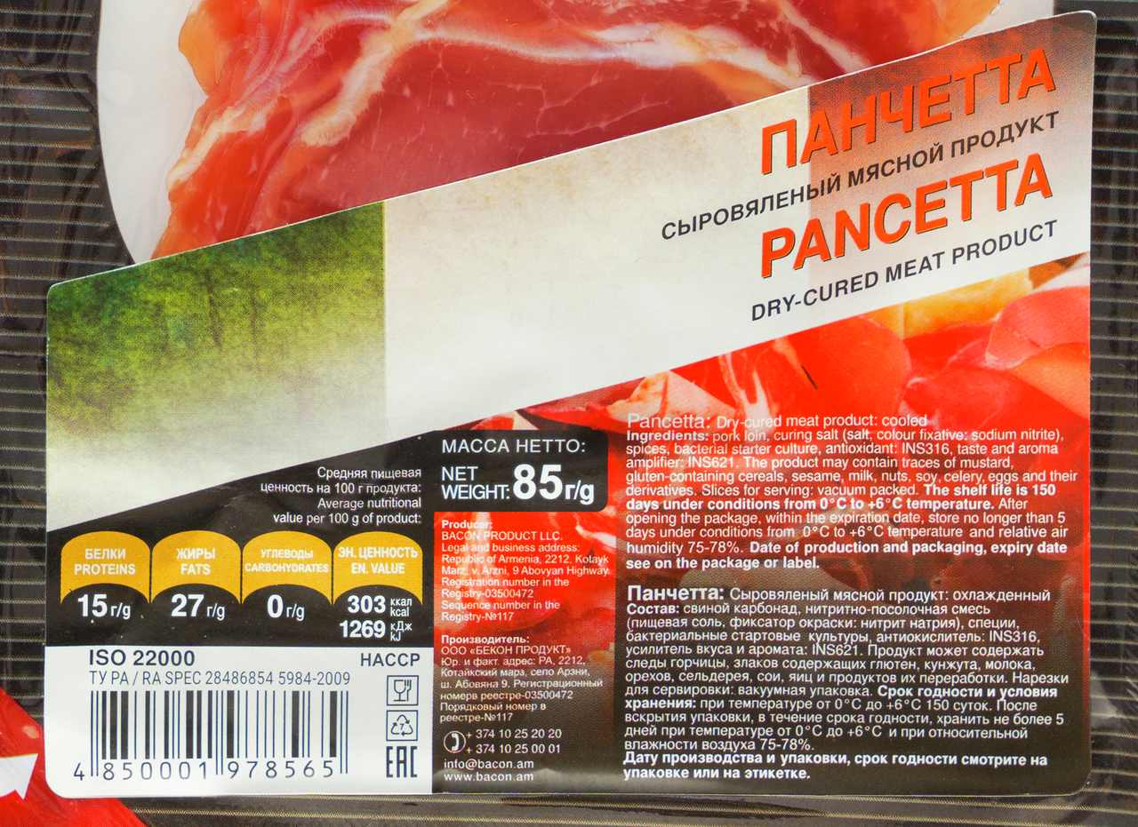 Колбаса Bacon Панчетта сыровяленая нарезка, 85г