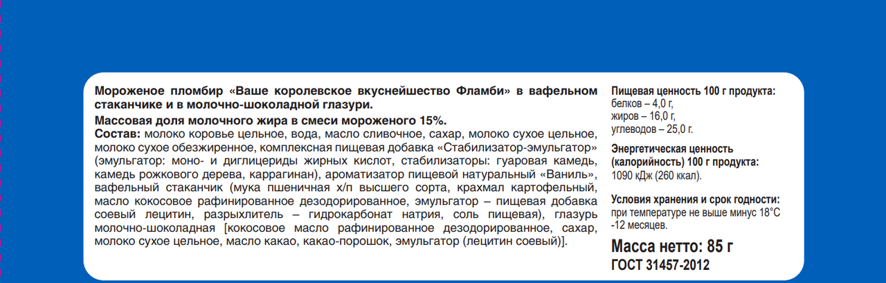 Молоко коровье цельное, вода, масло сливочное, сахар, молоко сухое цельное, какао-порошок, молоко сухое обезжиренное, комплексная пищевая добавка Стабилизатор-эмульгатор (эмульгатор: моно- и диглицериды жирных кислот, стабилизаторы: гуаровая камедь, камедь рожкового дерева, каррагинан), вафельный стаканчик (мука пшеничная хлебопекарная высшего сорта, крахмал картофельный, масло кокосовое рафинированное дезодорированное, эмульгатор – пищевая добавка соевый лецитин, разрыхлитель – гидрокарбонат натрия, соль пищевая), глазурь молочно-шоколадная (кокосовое масло рафинированное дезодорированное, сахар, молоко сухое цельное, масло какао, какао-порошок, эмульгатор (лецитин соевый)).