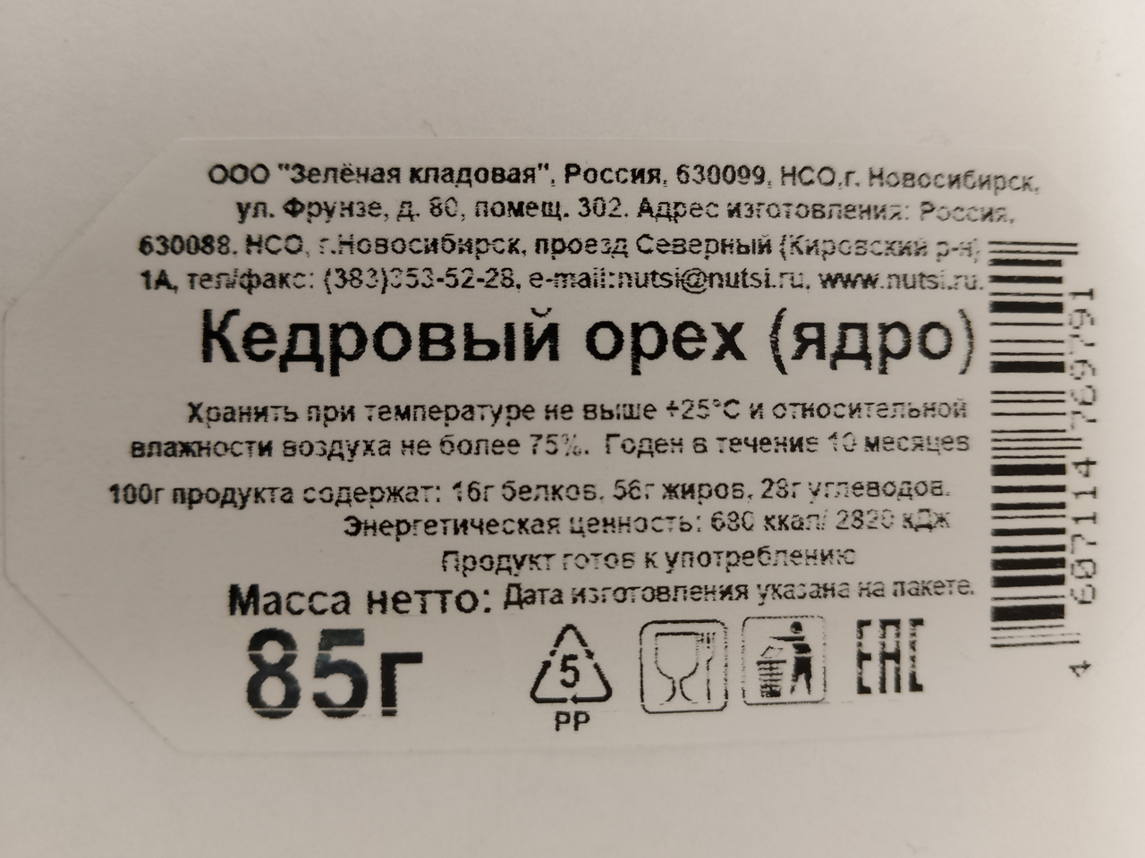 Орех кедровый ядро, 85г