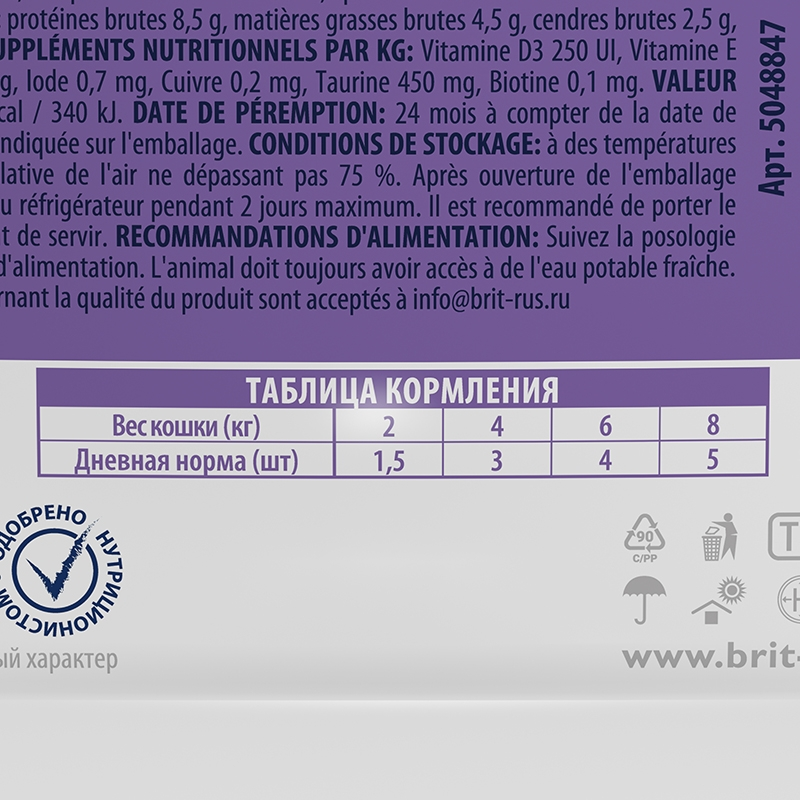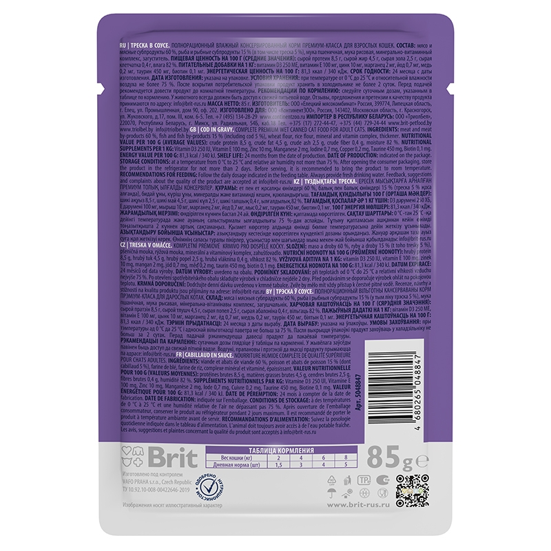 Полнорационный влажный корм премиум класса для взрослых кошек с треской в соусе. Нежные кусочки трески в ароматном соусе - идеальное сочетание для полноценного и сбалансированного рациона. Паучи Brit Premium однозначно заинтересуют вашу кошку и станут для нее любимым блюдом. Влажный корм содержит все необходимые витамины и минералы, которые необходимы стерилизованному питомцу. Таурин в составе – важный ингредиенты для поддержания остроты зрения и здоровья сердечно-сосудистой системы кошек.