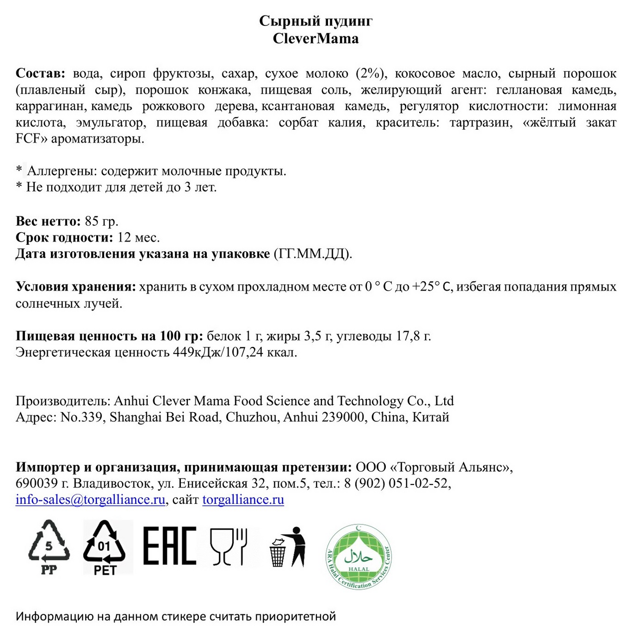 Оригинальный десерт пудинг Clever Mama с сырным вкусом. Отличный питательный перекус для детей и взрослых. Удобная индивидуальная упаковка с ложечкой внутри сохраняет свежесть продукта и позволяет брать его с собой. Необычный вкус и полезный состав понравятся тем, кто любит интересные гастрономические сочетания.