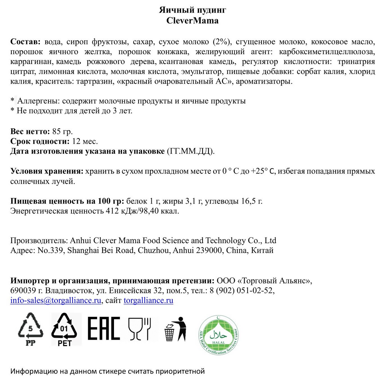 Оригинальный десерт пудинг Clever Mama с необычным яичным вкусом и карамелью. Отличный питательный перекус для детей и взрослых. Удобная индивидуальная упаковка с ложечкой внутри сохраняет свежесть продукта и позволяет брать его с собой. Необычный вкус и полезный состав понравятся тем, кто любит интересные гастрономические сочетания.