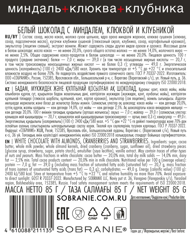 Сахар, масло какао, молоко сухое цельное, молоко сухое обезжиренное, ядро ореха миндаля жареное, клюква сушеная (клюква, сахар, подсолнечное масло), клубника сублимационной сушки, сыворотка сухая молочная, эмульгатор (лецитин соевый), экстракт ванили.