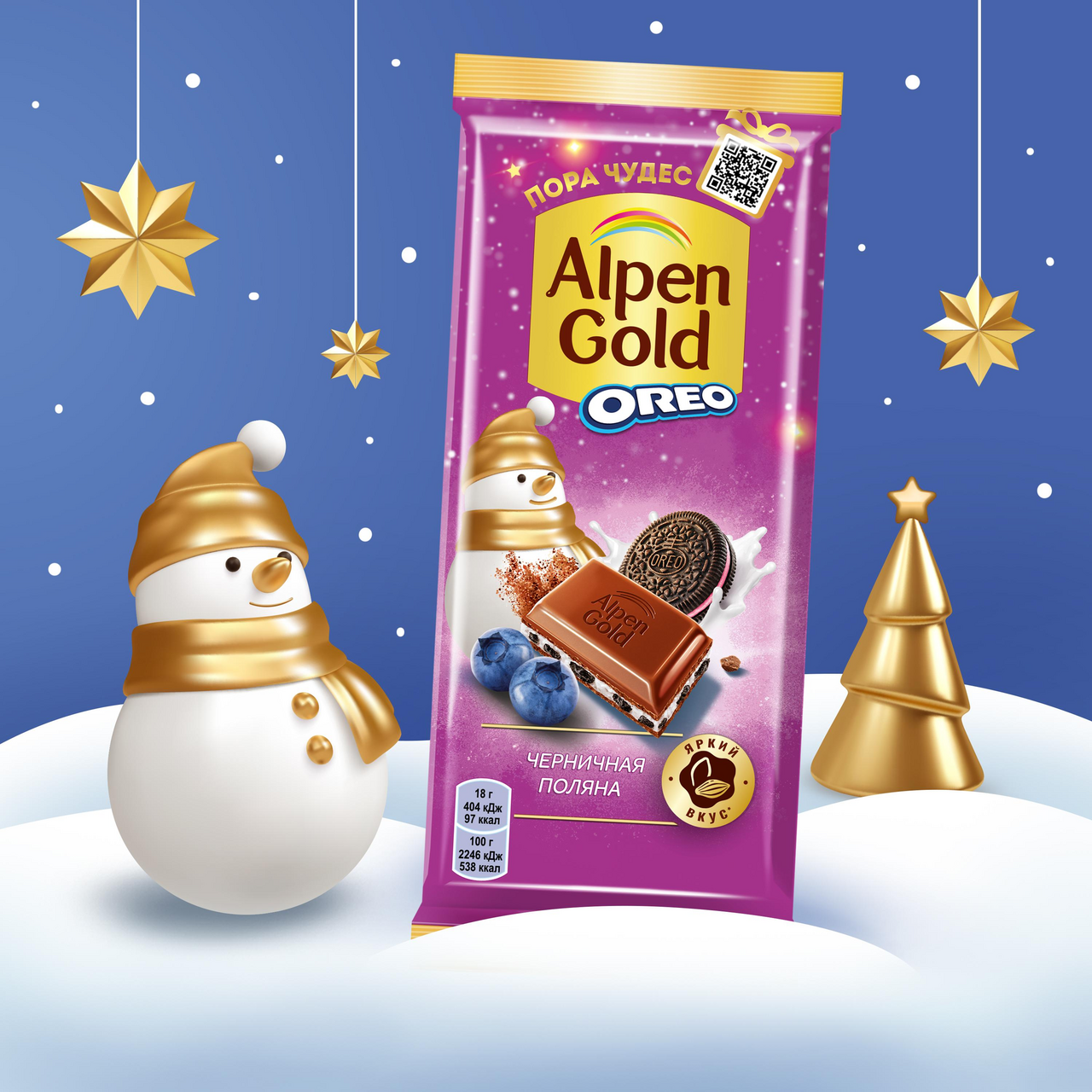 Участвует в конкурсе: Выиграйте кофемашину на сладкое! Совершите покупку товаров-участников на сумму от 1500₽ с 23 октября 2025г. по 14 января 2026г. и получите шанс выиграть кофемашину или другие сладкие призы! Чем больше покупок - тем больше шансов на победу! Подробнее об акции - https://cdn.metro-cc.ru/ru/mndlz_2025.pdf. Это лакомство, которое обязательно понравится всем сладкоежкам. Внутри шоколада скрывается нежная начинка с черничным вкусом и кусочками популярного печенья. Это яркий микс молочного шоколада, любимого во всем мире какао-печенья Oreo и разнообразных ингредиентов, которые делают этот союз еще вкуснее. В шоколаде Alpen Gold Oreo с начинкой со вкусом нежной черники и кусочками печенья сочетаются мягкая и хрустящая текстура, образуя невероятно вкусный десерт с приятным черничным послевкусием. Шоколад изготовлен по высоким стандартам качества из натуральных какао-продуктов.