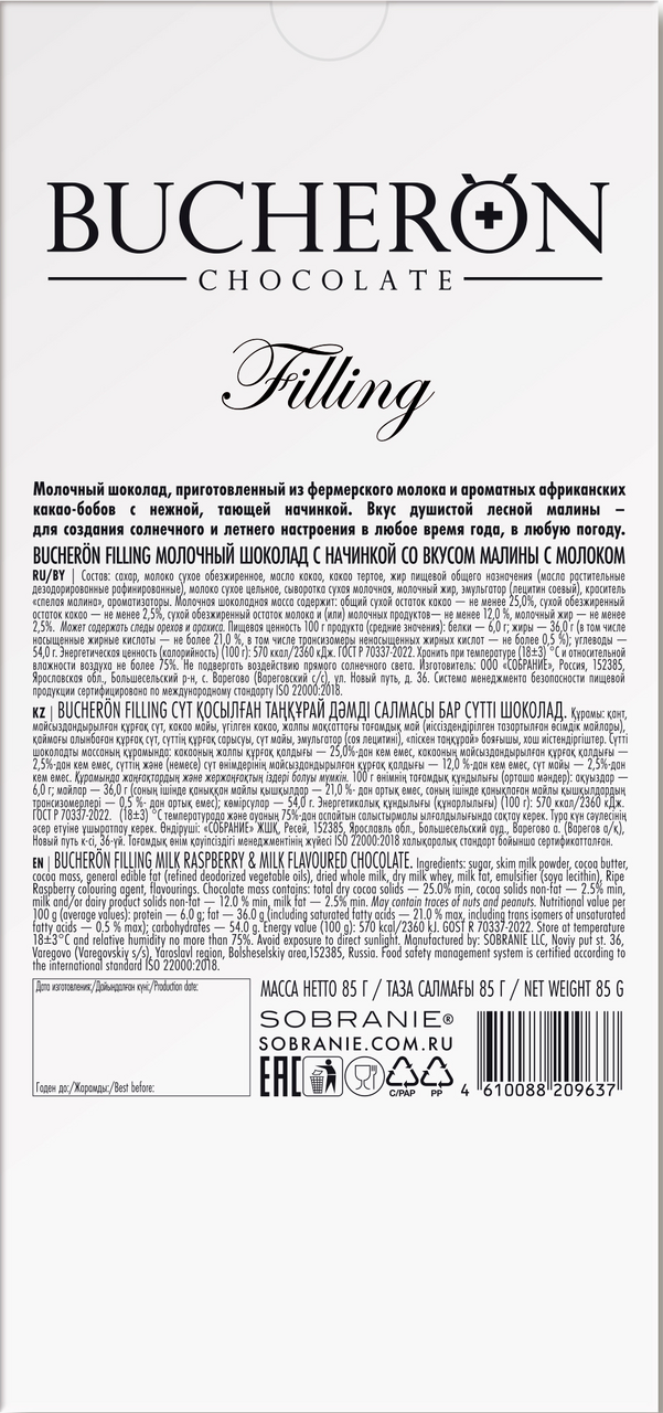 Шоколад Bucheron Filling молочный малина и молоко, 85г
